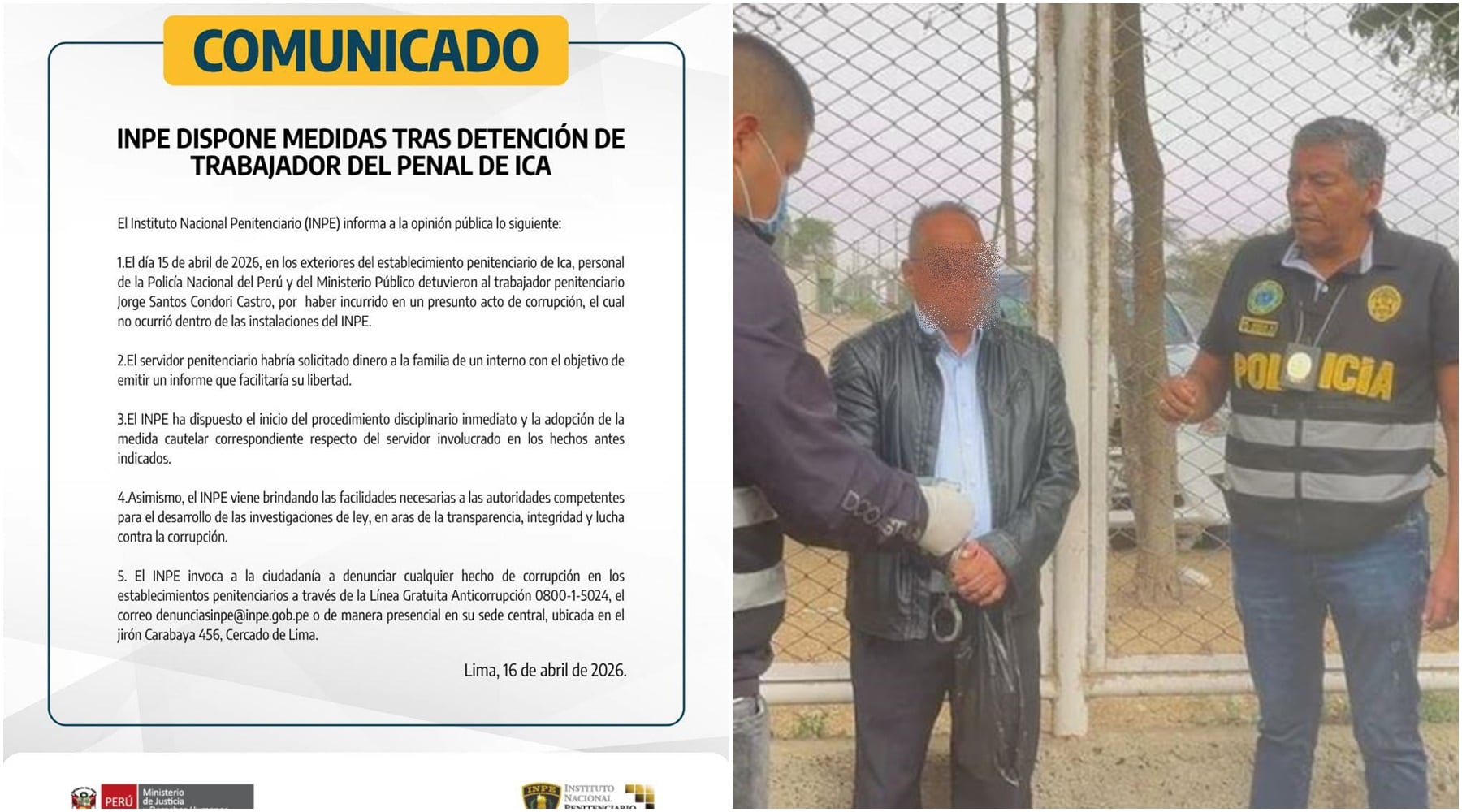 En respuesta, el INPE informó el inicio inmediato de un procedimiento disciplinario y la aplicación de una medida cautelar contra el trabajador investigado. Asimismo, precisó que los hechos no ocurrieron dentro del penal y ratificó su disposición de colaborar con las autoridades, reiterando su política de transparencia y lucha contra la corrupción.