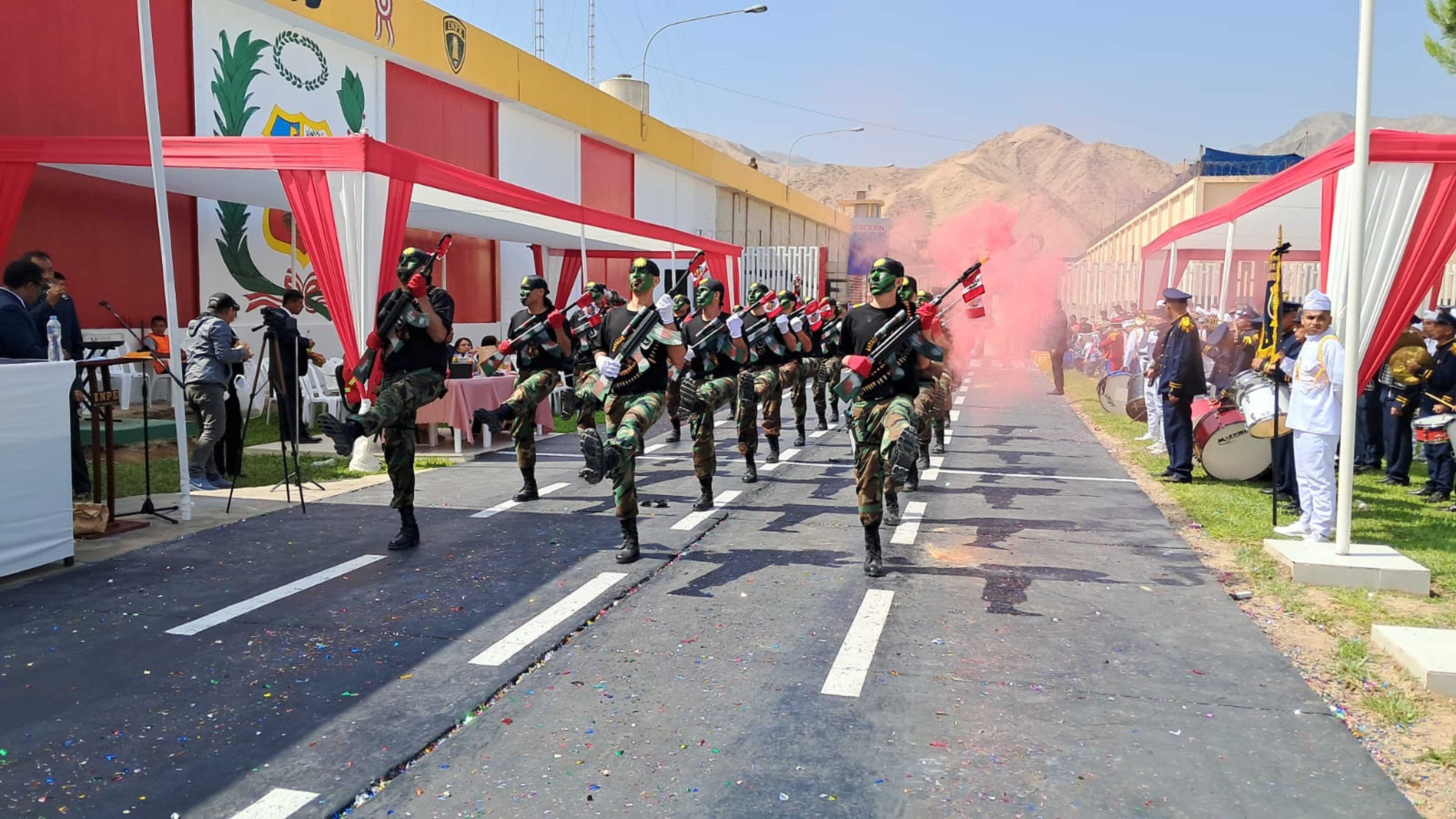 Durante el desfile, los presos mostraron todas esas horas de preparación. Las mujeres de los pabellones 7A, y 7B fueron las primeras en aparecer en esta actividad patriótica que fomenta el civismo en la cárcel. Luego aparecieron los internos de los demás módulos, luciendo vestimenta militar con réplica de armamento de madera creado en el taller de carpintería y otras indumentarias y vehículos desarrollados con material de reciclaje.