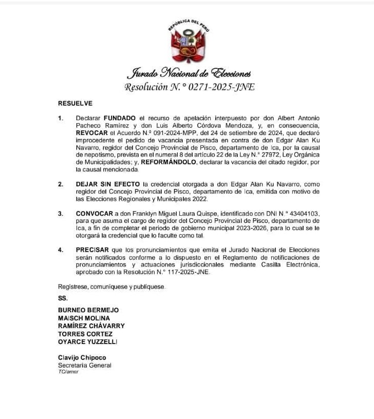 Como parte de esta decisión, también se dejó sin efecto la credencial otorgada a Alan Kú tras las elecciones municipales de 2022, y se dispuso la incorporación de Franklyn Miguel Laura Quispe como nuevo regidor del Concejo Provincial de Pisco, para completar el periodo 2023-2026. El JNE emitirá la credencial correspondiente para su incorporación formal.