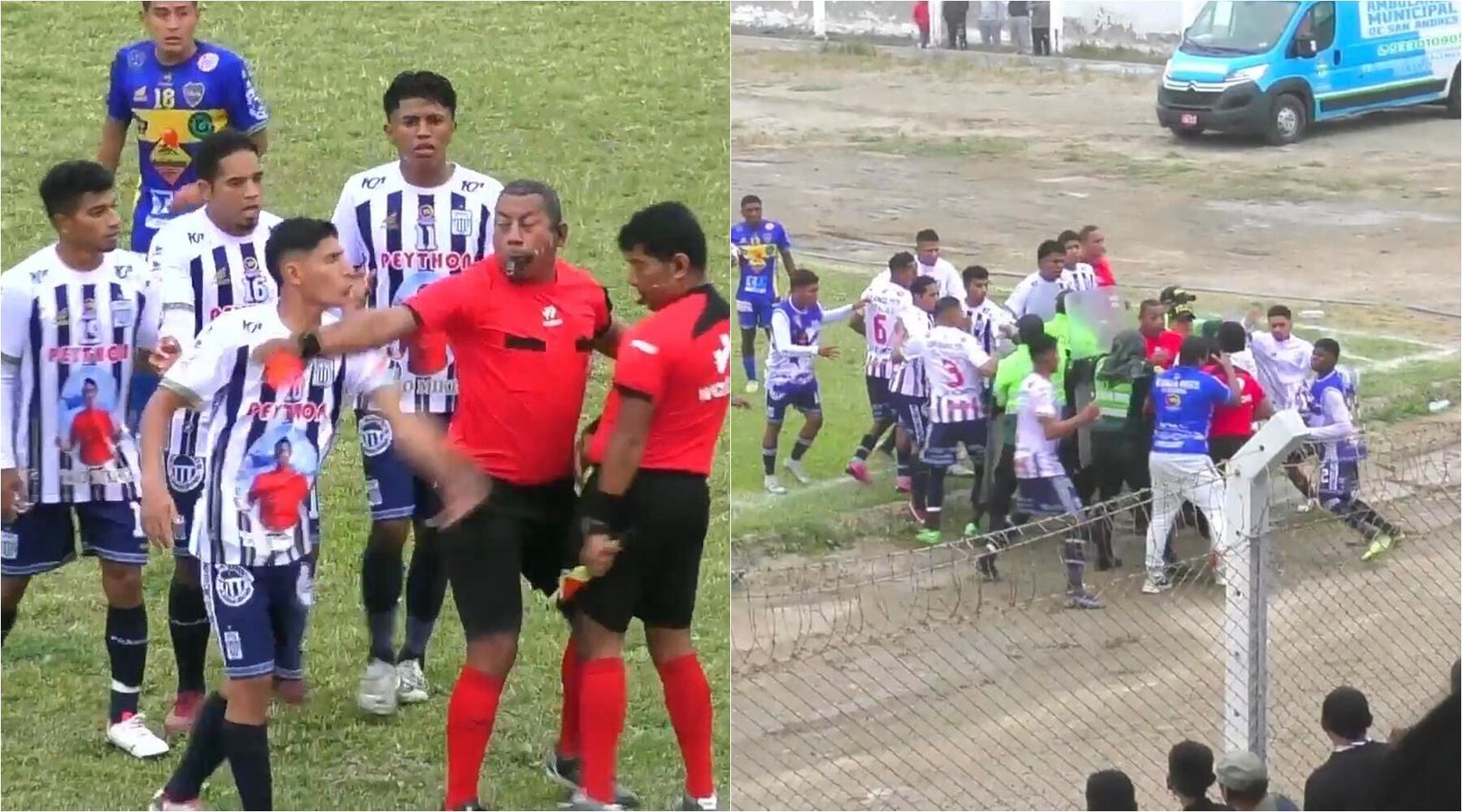 En segundos se desata una agresión campal, con más de una decena de jugadores del Alianza Pisco que intentan masacrar a los jueces deportivos. La policía tuvo que intervenir para controlar la situación, mientras los jugadores seguían en su intento de propina puñetes y patadas al juez de línea.