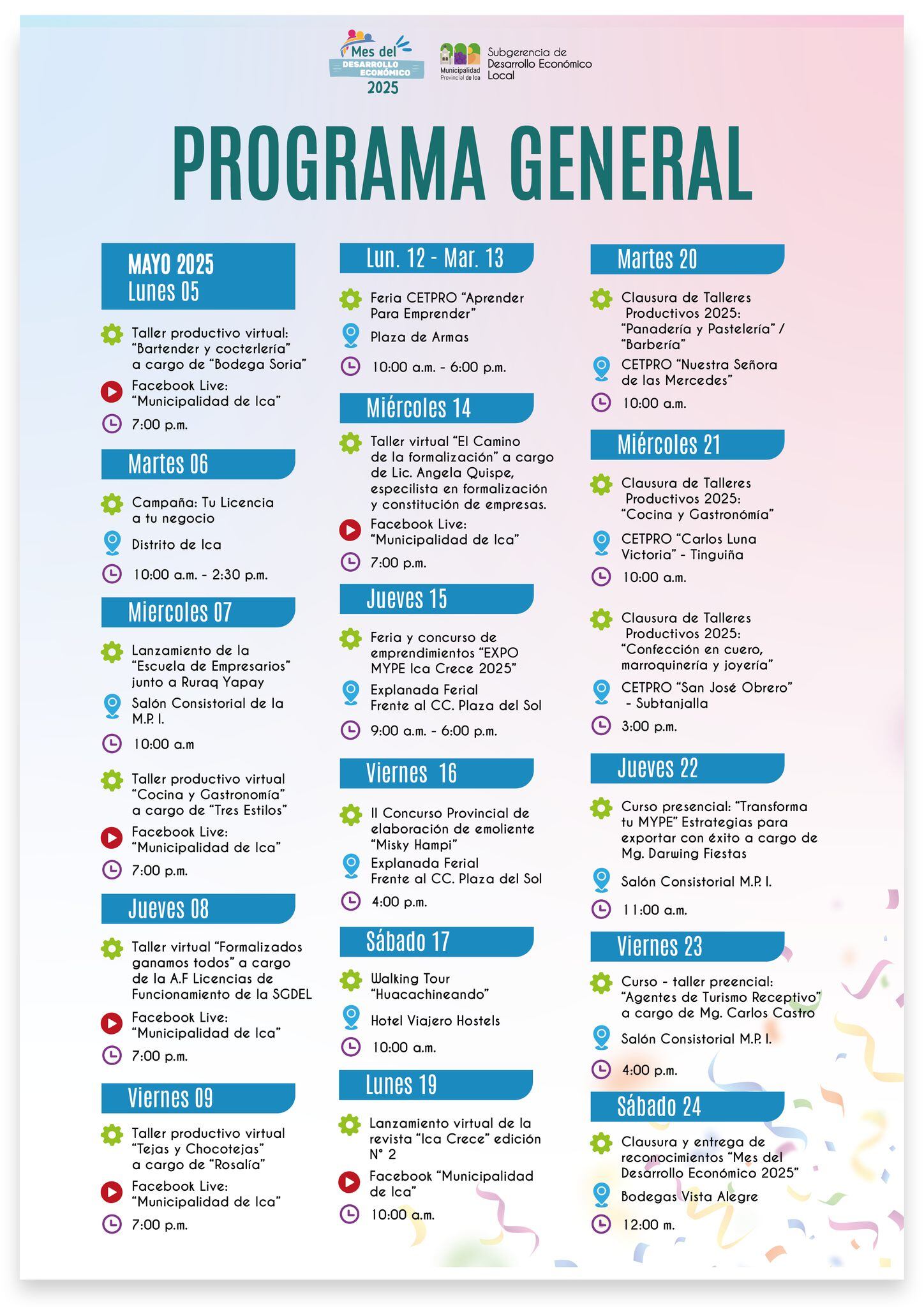Asimismo, se precisó que el viernes 9 será el taller productivo virtual “tejas y chocotejas” a cargo de “Rosalía”. El lunes 12 y martes 13 de mayo es la feria CETPRO “Aprender para Emprender”, en la plaza de Armas de Ica y el 14 de mayo el taller virtual “El camino de la formalización”, mientras que al otro día el concurso de emprendimiento “Expo MYPE Crece 2025”, en la explanada frente al C.C. Plaza del Sol.