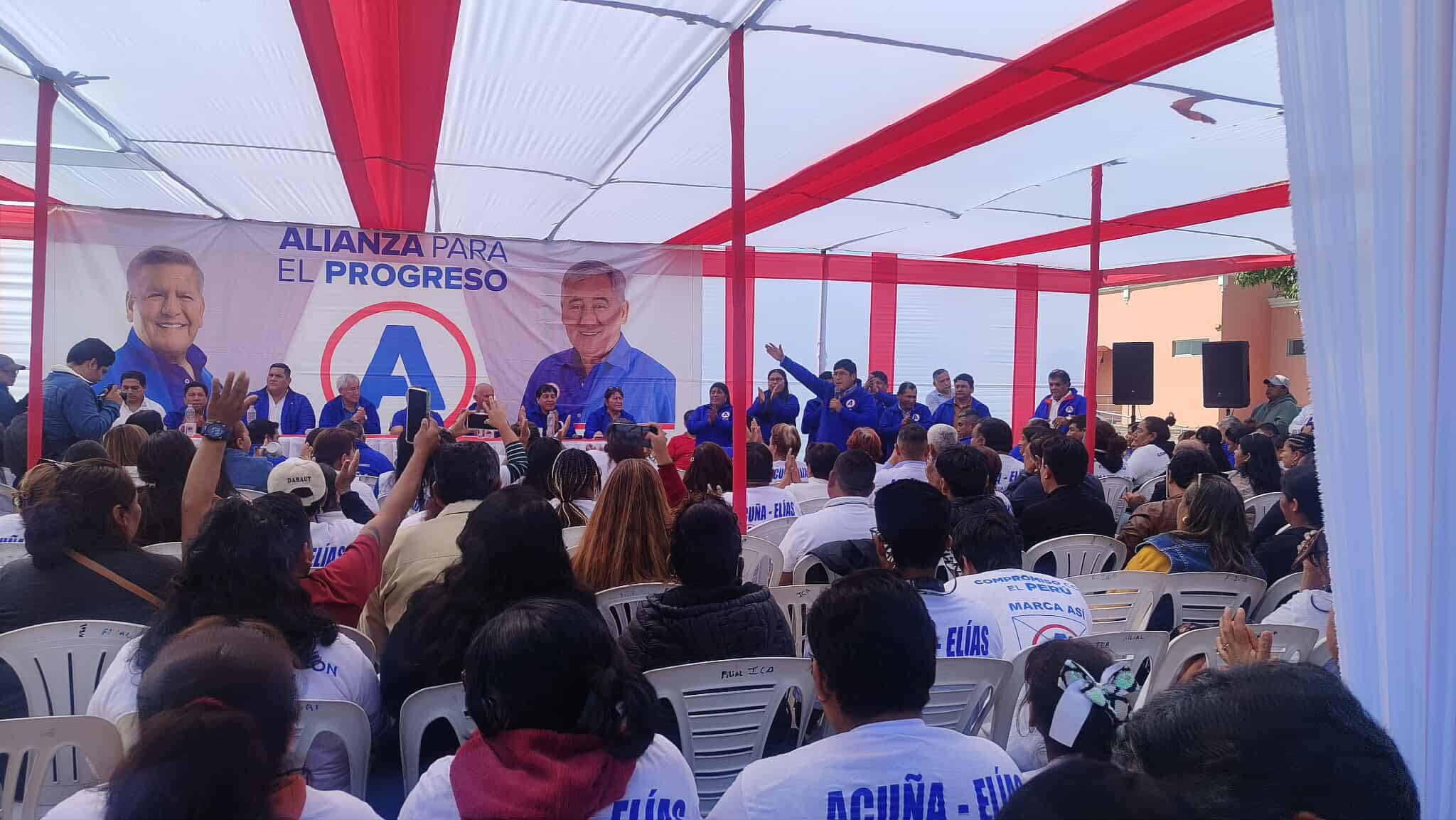 Entre los acompañantes de Acuña se encontraban el alcalde provincial de Nasca, Jorge Bravo Quispe, y el congresista por Ica, José Luis Elías Ávalos, quien fue captado junto a una taza con su imagen y la frase “José Luis Elías, senador por Ica”. También estuvieron presentes el consejero regional de Ica, Luis Castro Makabe; la regidora provincial de Ica, Nélida Cecilia García; y la regidora distrital de Los Aquijes, Karol Rojo Ventura, entre otros representantes y militantes de APP.
