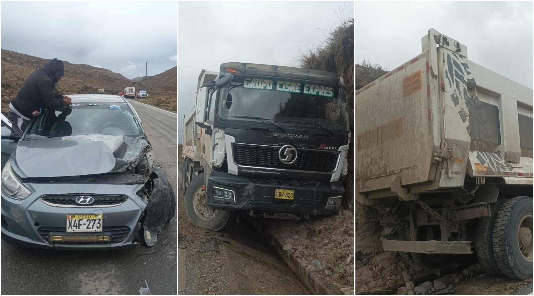 El choque involucró a un automóvil Hyundai de placa X4F-273, que terminó con serios daños en la parte frontal, además de una camioneta de placa X4Y-086, un vehículo con placa X4S-694 y un camión volquete de placa CBW-828, el cual quedó fuera de la vía tras el impacto.
