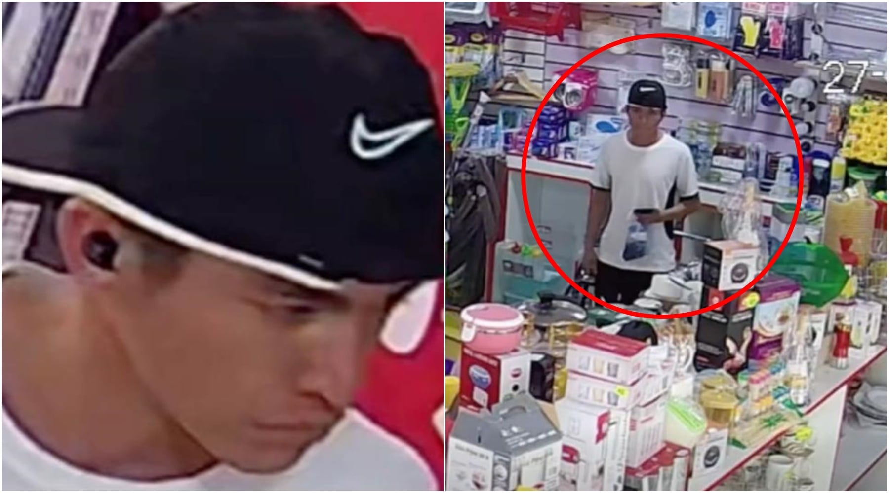 Según las imágenes de seguridad, el incidente ocurrió alrededor de las 10:00 a. m., cuando el individuo ingresó al local comercial “Diego’s Importaciones”, vestido con polo blanco y short negro. Tras permanecer algunos segundos observando el interior del establecimiento y verificar que no había personal cerca, se aproximó al mostrador.