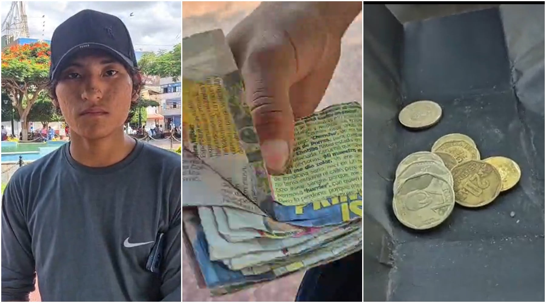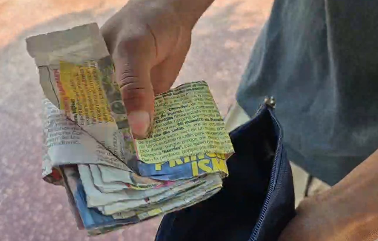 Sin embargo, minutos después, al intentar revisar el contenido, el joven descubrió que había sido víctima de una estafa. El paquete contenía únicamente recortes de papel periódico cuidadosamente doblados para simular fajos de dinero, junto con algunas monedas de bajo valor. “Cuando abrí el paquete, vi que solo eran papeles y monedas sin valor. Ahí me di cuenta de que me habían engañado”, señaló.