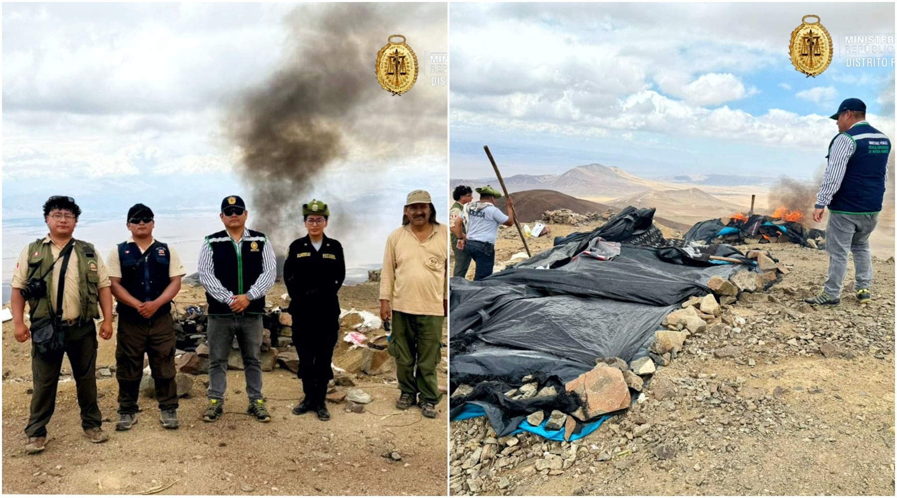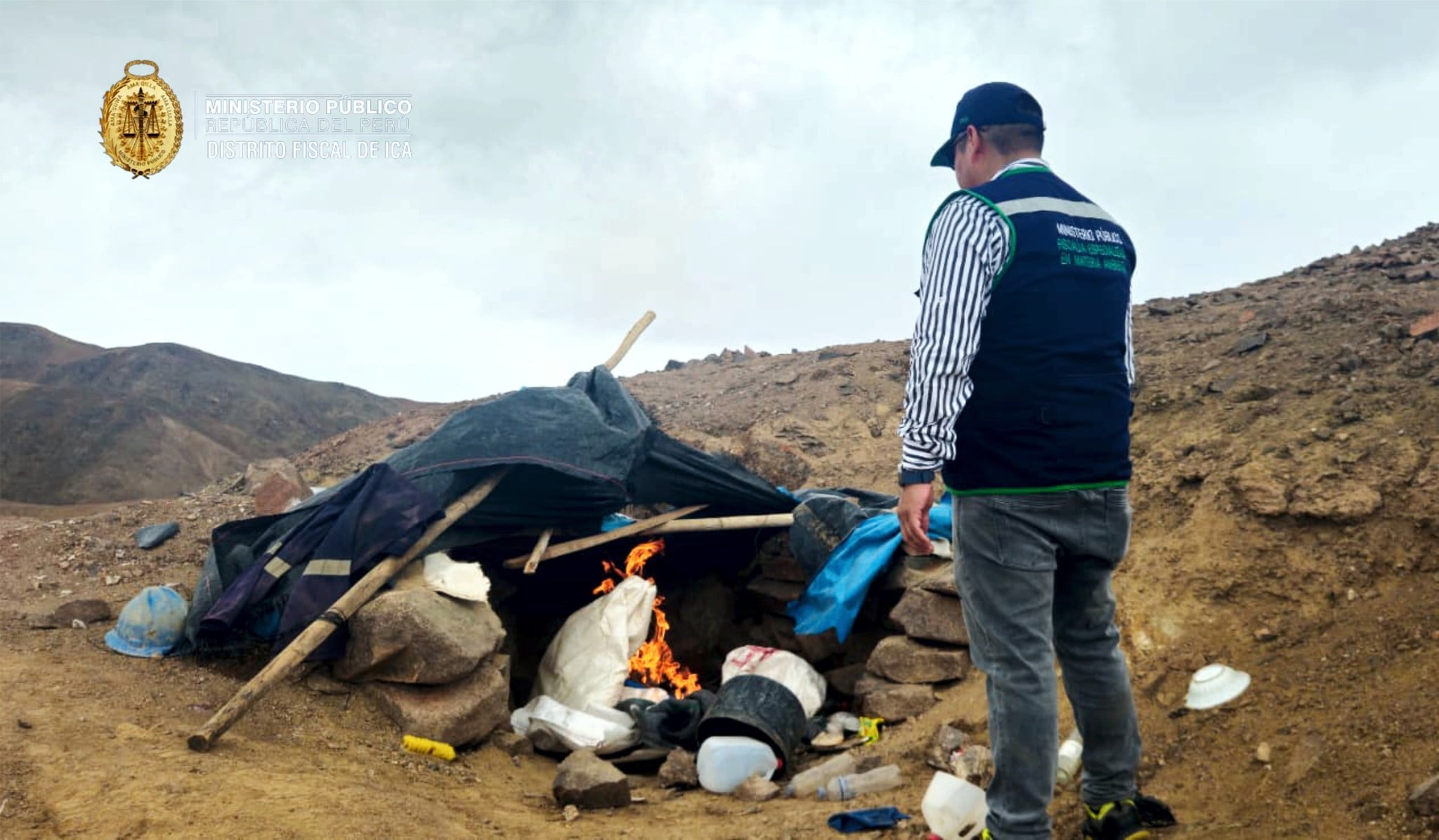 Durante la intervención, realizada en el sector sur del cerro Huaricangana, las autoridades advirtieron la presencia de personas que huyeron del lugar al notar la presencia fiscal y policial. Tras el recorrido, se hallaron ocho campamentos mineros rústicos de aproximadamente 3 x 4 metros, construidos con materiales precarios, encontrándose en su interior colchones, frazadas y utensilios personales que evidenciaban ocupación reciente.