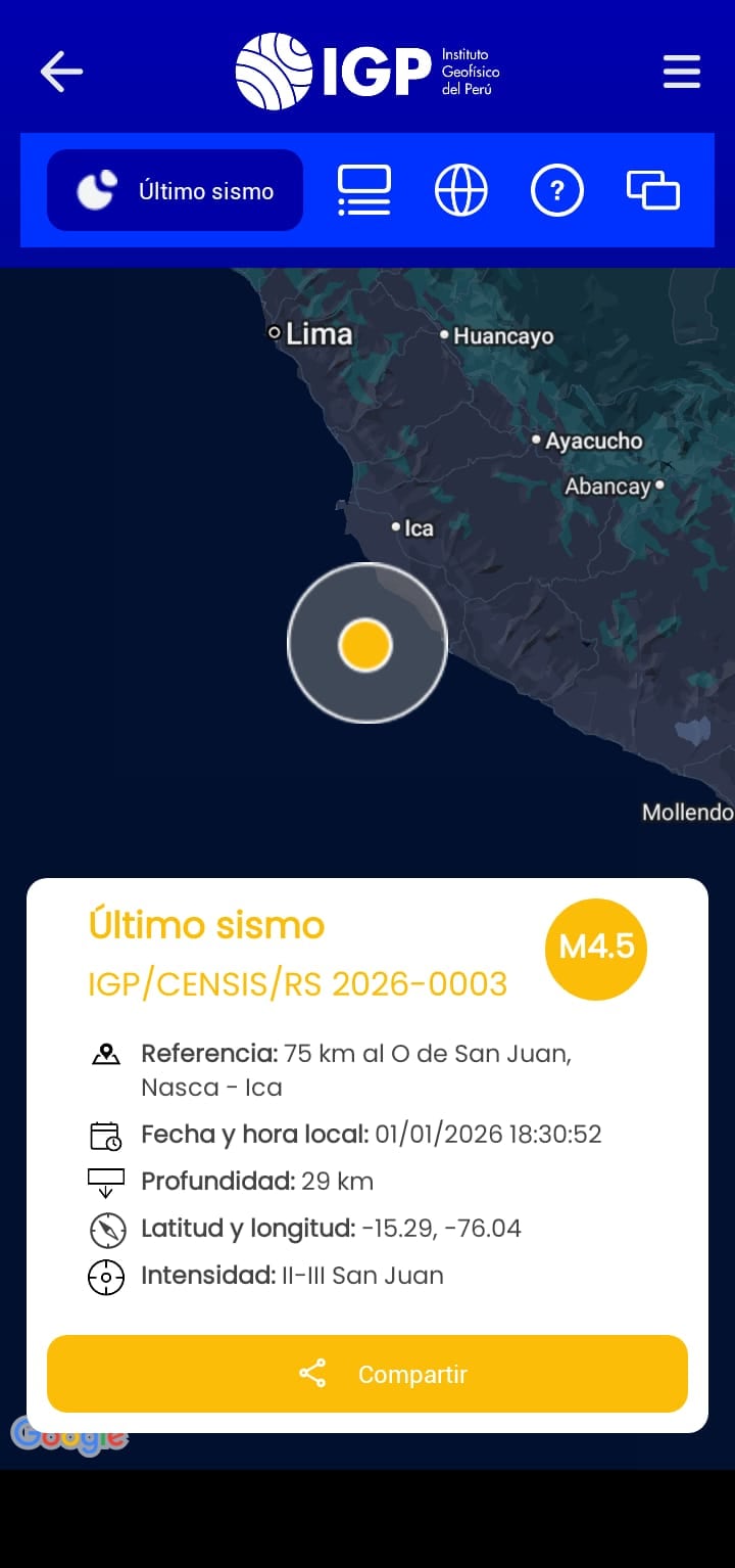 Cabe señalar que hoy 1 de enero, también se registró el primer sismo en Marcona. Ocurrió a las 05:20 de la mañana y alcanzó una magnitud de 4.4, con una profundidad de 32 kilómetros.