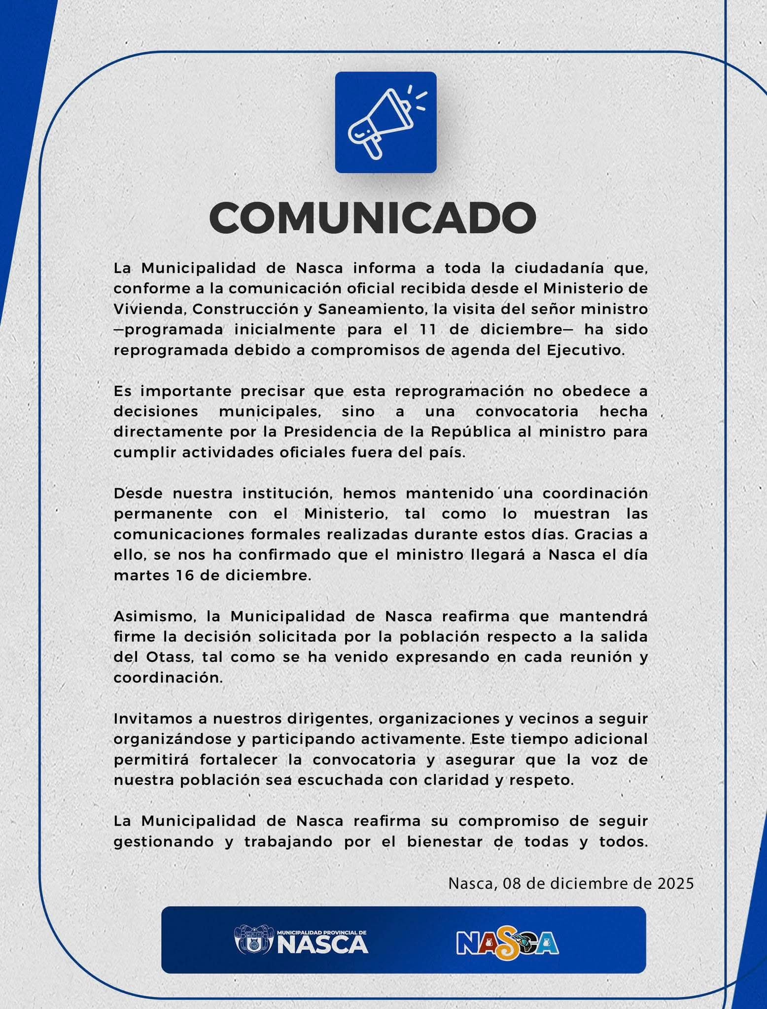 En tanto, la visita del Ministro de Vivienda, Construcción y Saneamiento. Wilder Sifuentes a Nasca, inicialmente prevista para el 11 de diciembre, ha sido reprogramada para el martes 16 de diciembre.