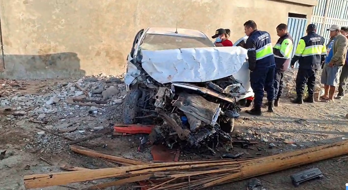 El vehículo, que circulaba en dirección de sur a norte, era propiedad de la empresa D&J Rental Cars Service SAC, y quedó completamente destrozado en su parte delantera tras la colisión. El impacto fue tan fuerte que el poste colapsó y la pared de la vivienda quedó con un forado de gran tamaño.