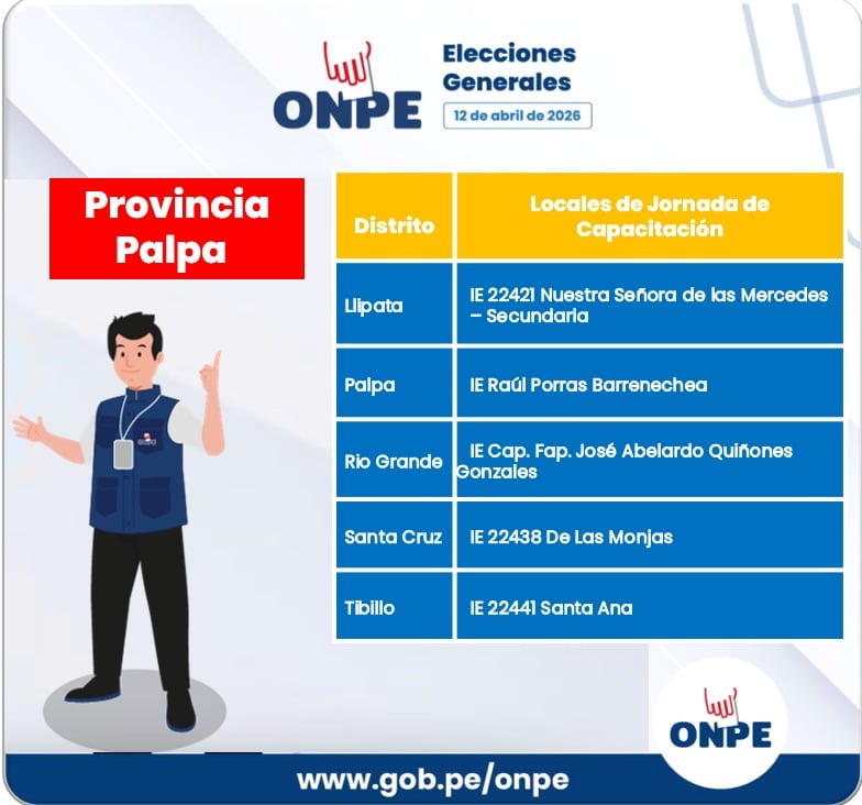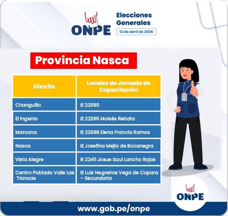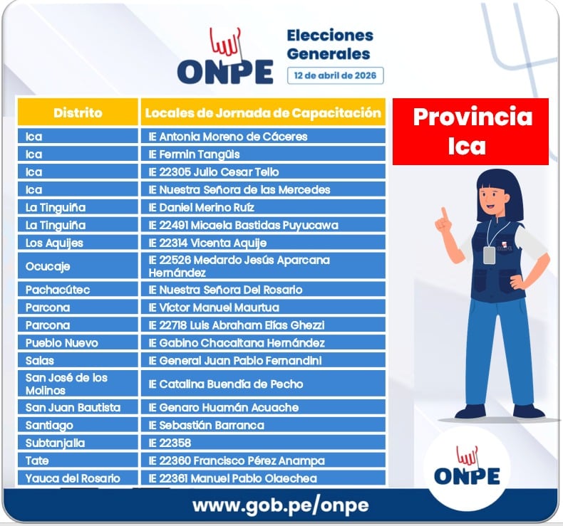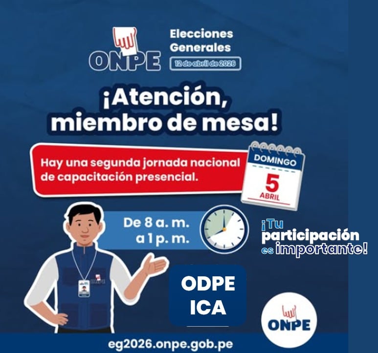 La ODPE Ica invitó a la segunda jornada de capacitación que se realizará hoy domingo 5 de abril en 30 locales que se habilitarán en los 24 distritos y un centro poblado en las provincias de Ica, Nasca y Palpa. En esta actividad masiva se repetirá la metodología que combina exposiciones de capacitadores y prácticas con materiales similares a los que se usarán el día de los comicios.