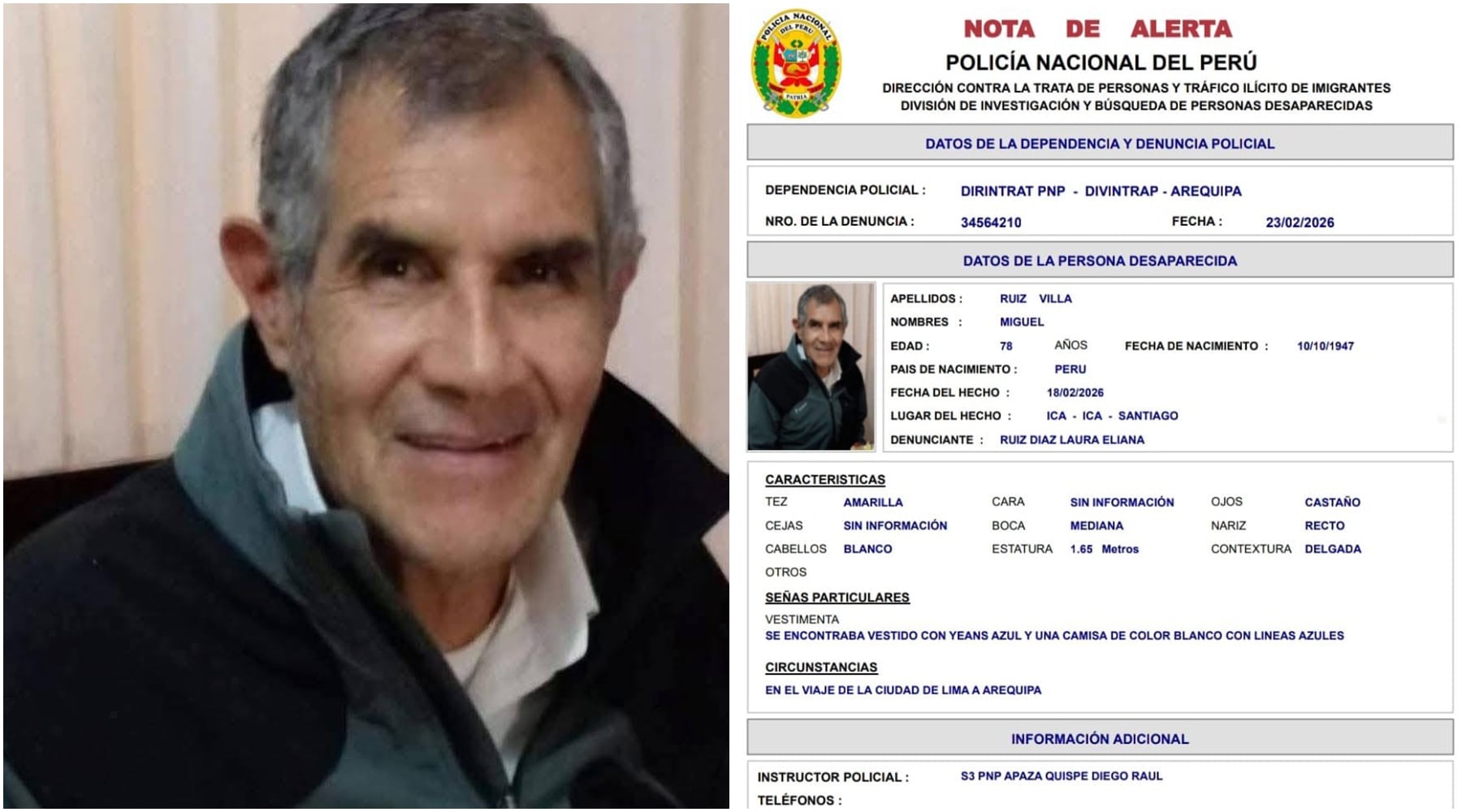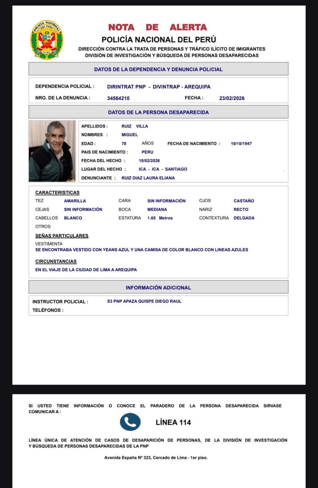 El adulto mayor abordó la unidad el miércoles 18 de febrero en el puente Atocongo, en Lima, con destino a Arequipa; sin embargo, desde el accidente no se tiene información sobre su paradero y no figura en la lista oficial de heridos ni atendidos en centros de salud de Ica, Palpa o Nasca.