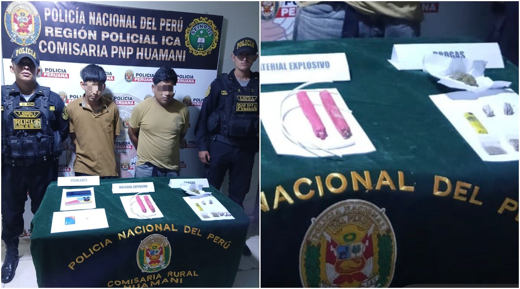 Ambos sujetos son investigados por la presunta comisión de los delitos de extorsión, posesión de material explosivo, tráfico ilícito de drogas, entre otros ilícitos penales, mientras el Ministerio Público continúa con las diligencias para determinar su real participación en hechos delictivos registrados en San Clemente y zonas aledañas.