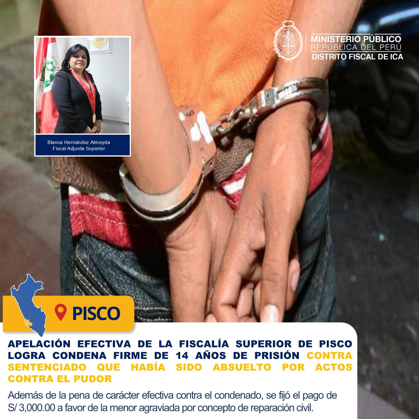 La Fiscalía Superior Penal de Pisco a cargo de la Dra. Blanca Hernández Almeyda, logró la revocatoria de la sentencia absolutoria y se dicte condena de 14 años de prisión efectiva contra Michael Moisés Taipe Melgar, como autor y responsable del delito contra la libertad sexual, en la modalidad de tocamientos o actos libidinosos, en agravio de su menor hija de 5 años.