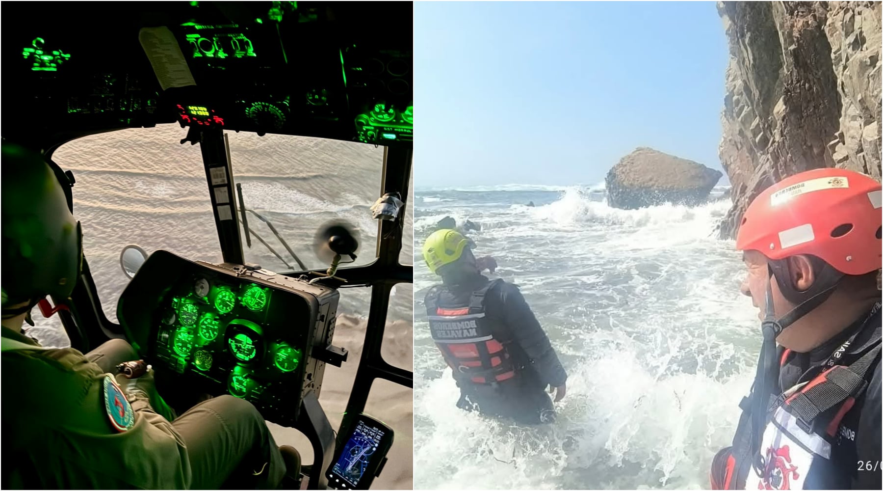 También se cuenta con el apoyo de drones enviados por la Municipalidad de San Borja y buzos artesanales que, de manera voluntaria, se han unido al esfuerzo, pese a las difíciles condiciones del mar, que actualmente presenta fuerte oleaje, oscuridad, algas y formaciones rocosas peligrosas.