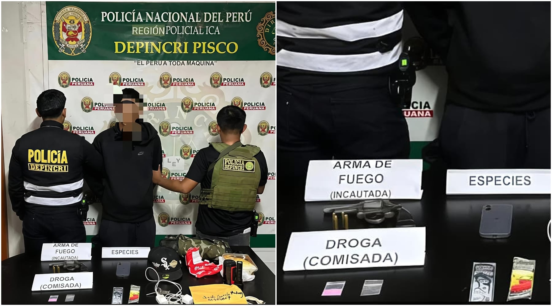 Efectivos del Área de Investigación Criminal (Areincri) de la Policía Nacional del Perú en Pisco intervinieron a un menor de 17 años, identificado con las iniciales J. J. G. M., quien fue sorprendido portando un arma de fuego y presuntas sustancias ilícitas en una zona céntrica de la ciudad, como parte de un operativo de respuesta inmediata contra la delincuencia.