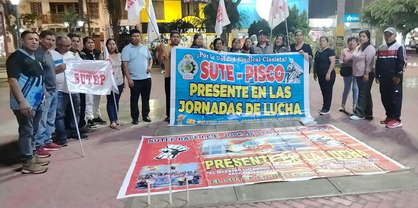 Docentes de la provincia de Pisco se concentraron en la plazuela Belén, frente a la iglesia del Señor de la Agonía, donde llevaron a cabo una vigilia como parte de la jornada nacional de lucha convocada por el sector educación. La actividad reunió a maestros que, con pancartas y arengas, expresaron su preocupación por la situación actual de la educación y exigieron atención inmediata a sus demandas.