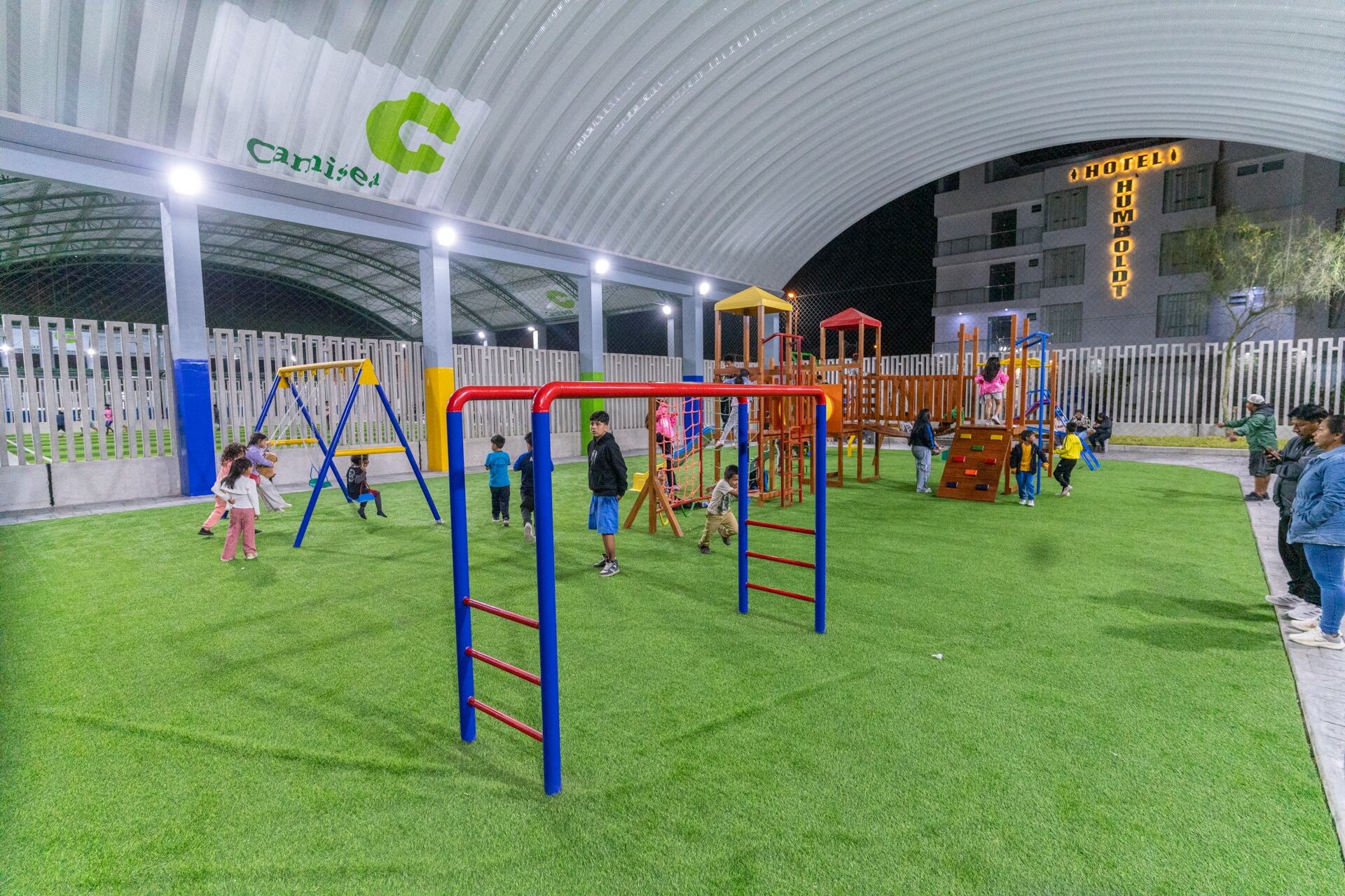 La obra incluyó el techado de áreas recreativas —parque infantil y zonas deportivas—, lo que permite su uso seguro durante todo el año. Se cambió la totalidad del grass sintético en la zona de juegos y campo de fútbol, y se instaló piso de poliuretano en las canchas de vóley y básquet. Además, se reemplazaron todos los juegos infantiles y se renovó la ludoteca municipal con nuevos equipos de psicomotricidad para niños de 0 a 5 años.
