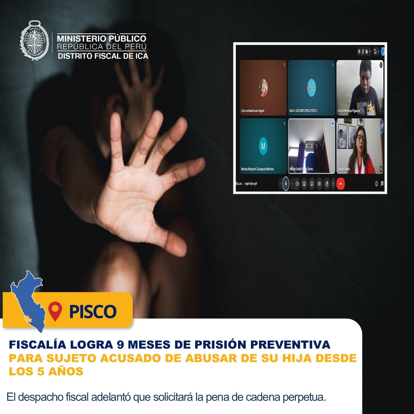 El Primer Despacho de la Primera Fiscalía Provincial Penal Corporativa de Pisco, bajo la dirección de la fiscal provincial Gladys Matilde Torres Lobato, logró que se dicte 9 meses de prisión preventiva contra Jorge Oscar Quispe Morales, investigado por el presunto delito de violación sexual de menor de edad en agravio de su propia hija biológica.