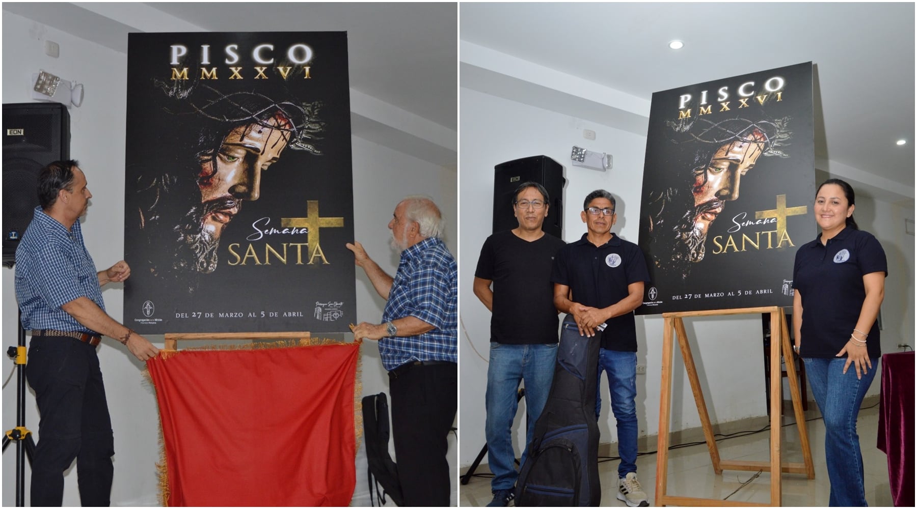 Uno de los momentos más esperados de la jornada fue la develación del cartel oficial de la Semana Santa Pisco 2026, una pieza artística de más de un metro de altura que captó la atención y admiración de los asistentes presentes y de quienes seguían la transmisión a través de redes sociales. El impactante afiche refleja el rostro doliente de Cristo de la Agonía coronado de espinas, iluminado en medio de la oscuridad, evocando el sacrificio redentor y el infinito amor de Dios por la humanidad. La obra fue diseñada por el Ingeniero Luis Hernández, de Luhal Productions.