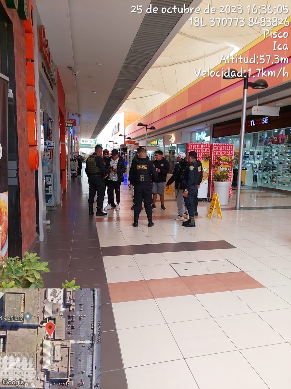 Los policías y serenos llegaron de inmediato al Megaplaza Pisco luego de recibir un llamado sobre algunos jóvenes que ingresaron en moto lineal con actitud sospechosa a las instalaciones del centro comercial activando las alertas por el personal del establecimiento, así como también de las fuerzas del orden.