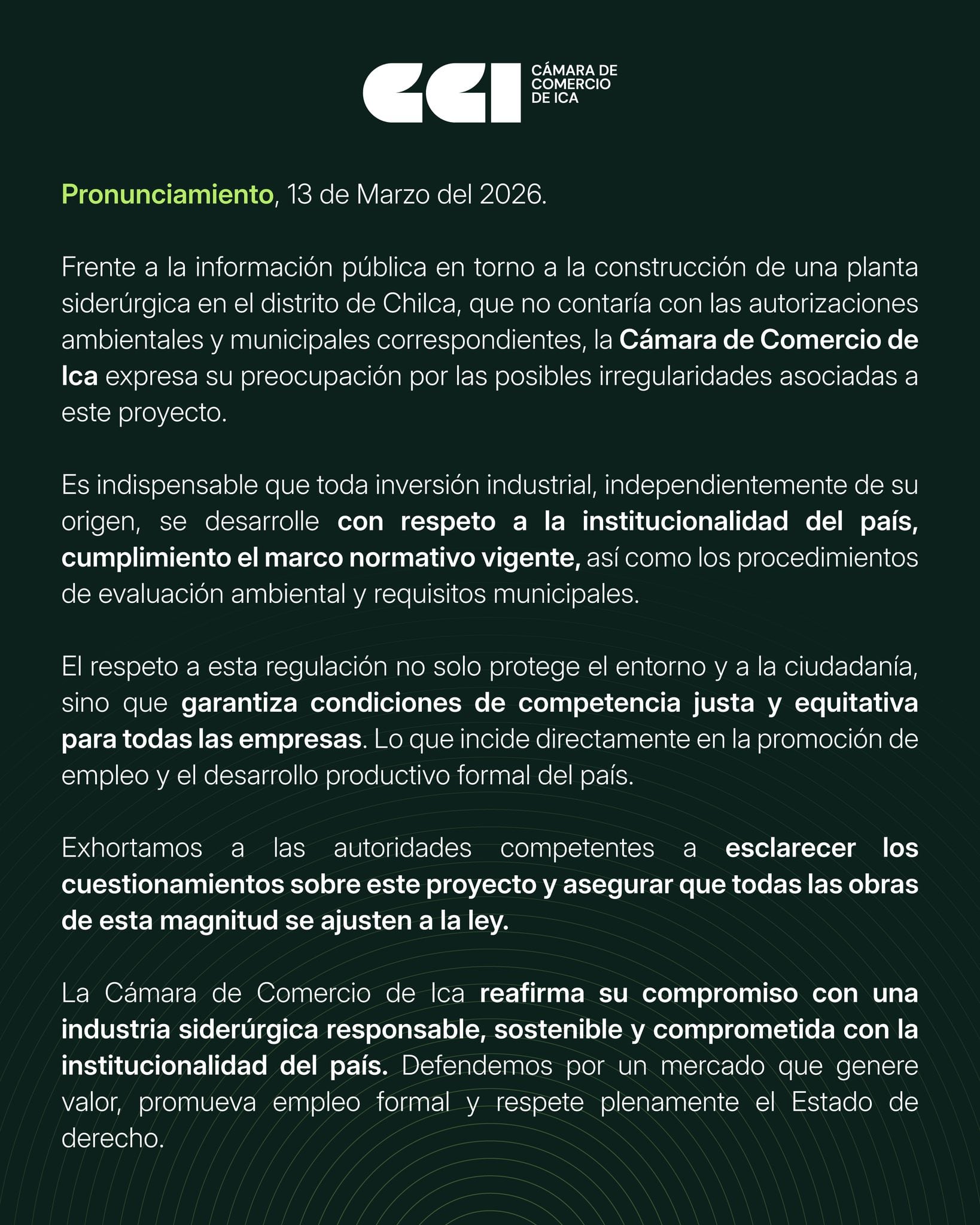 La Cámara de Comercio de Ica manifestó su preocupación ante la información difundida públicamente sobre la construcción de una planta siderúrgica en el distrito de Chilca, en la provincia de Cañete, la cual —según reportes— no contaría con las autorizaciones ambientales ni municipales correspondientes.