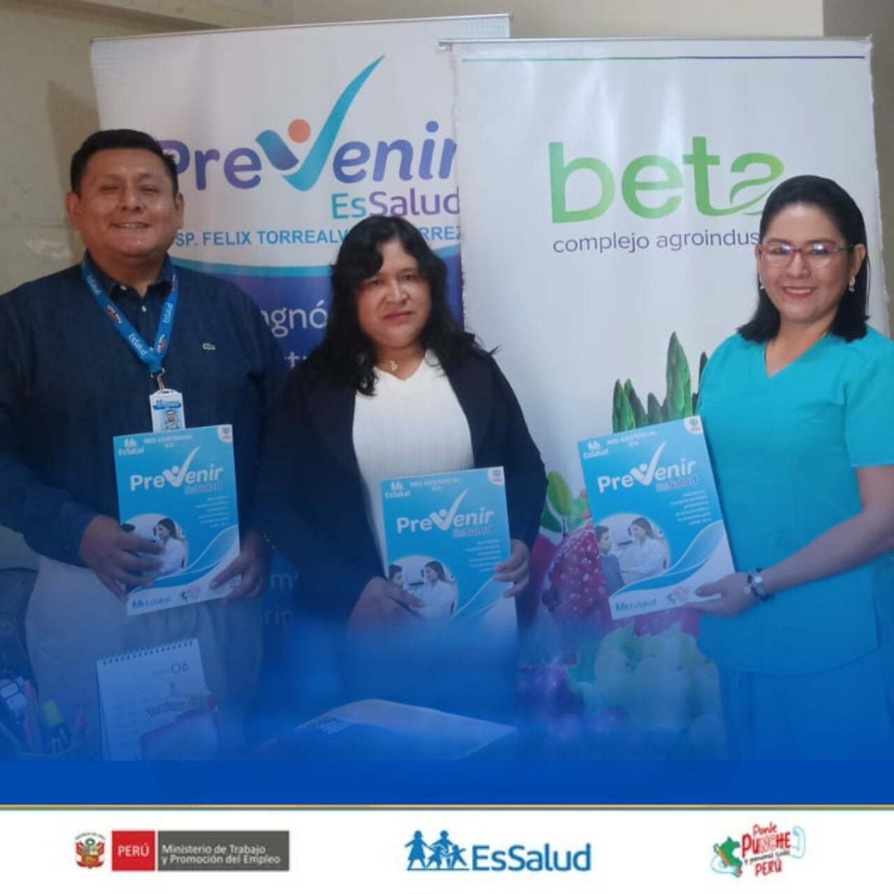 El Hospital Félix Torrealva Gutiérrez de EsSalud, firmó alianza estratégica con el complejo agroindustrial BETA que beneficiará a más de 300 trabajadores asegurados mediante el programa Prevenir, que busca fomentar una cultura de prevención y llevar servicios de salud directamente a los centros laborales.