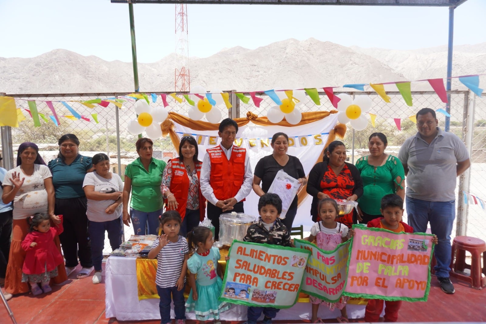 Las niñas y niños de la I.E.I. N° 853, en la provincia de Palpa, junto a sus profesores y padres de familia recibieron con carteles coloridos a las autoridades y se comprometieron a darle el uso adecuado a todos los bienes recibidos para la alimentación escolar.