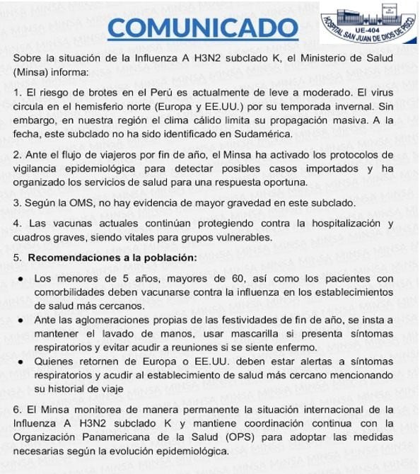 Ante la confirmación de casos de influenza H3N2 en el Perú. En la provincia de Pisco, se difundieron una serie de recomendaciones dirigidas a la población para reducir el riesgo de contagio y evitar una mayor propagación del virus en la comunidad.