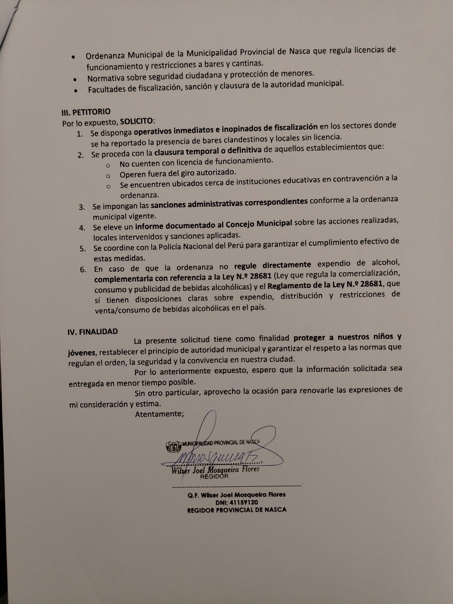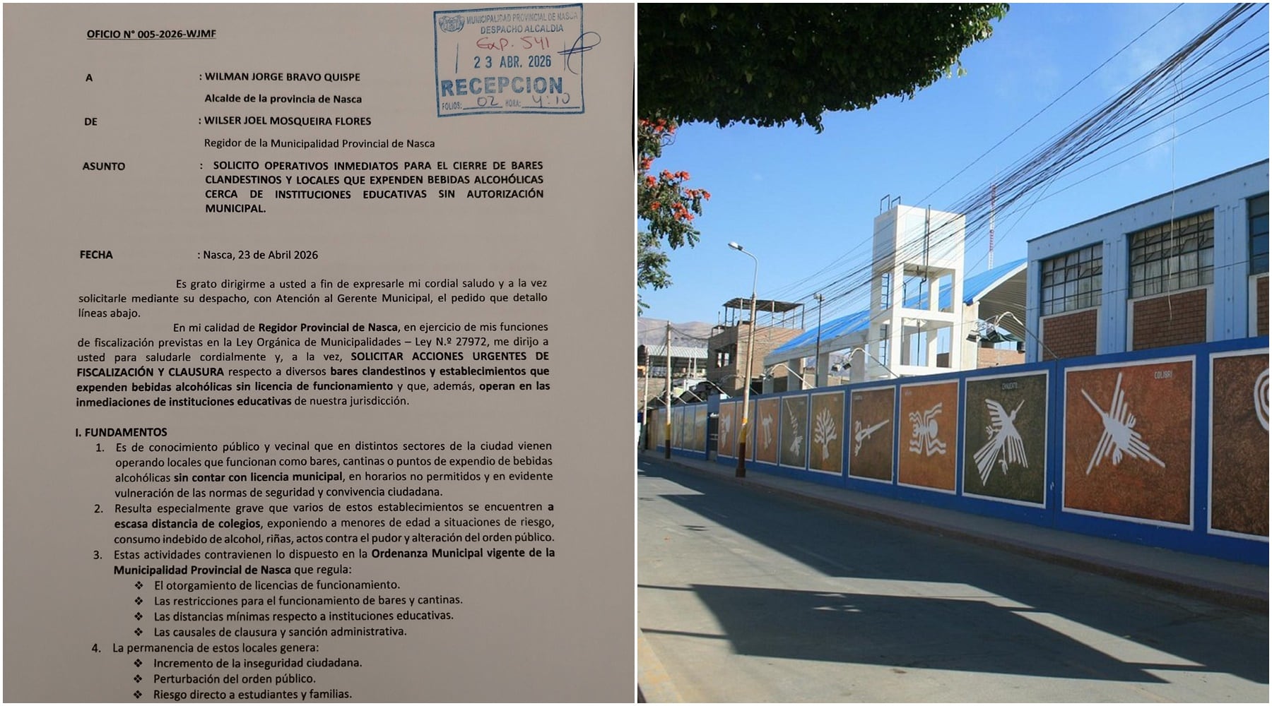 El regidor provincial de Nasca, Wilser Joel Mosqueira Flores presentó un oficio dirigido al alcalde Jorge Bravo, para solicitar operativos urgentes e inopinados contra bares clandestinos y establecimientos que funcionan sin licencia municipal.