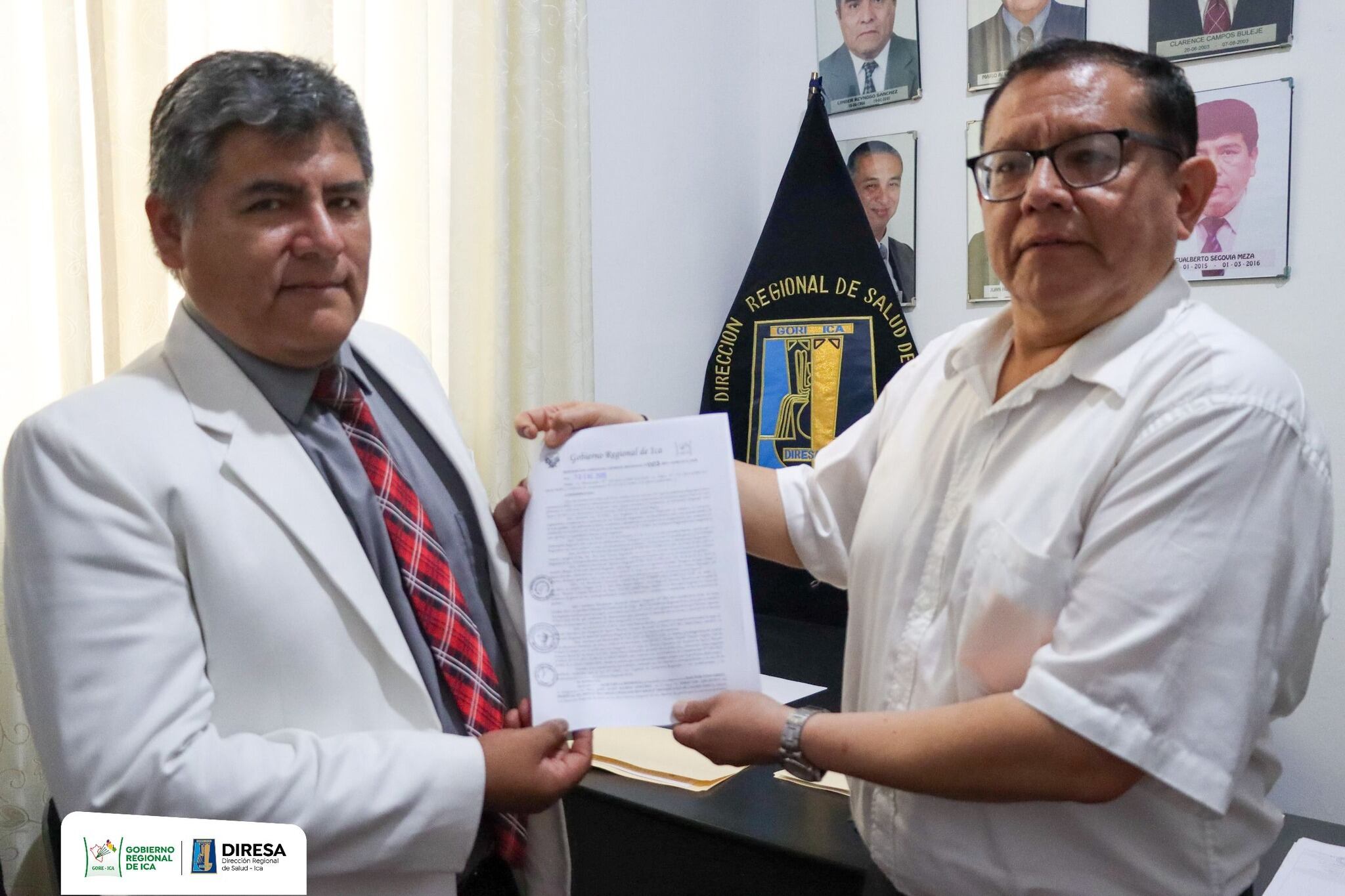 El Dr. Héctor Quispe Carrascal, Director Regional de Salud, efectuó la entrega de la Resolución Gerencial General Regional N° 003-2025-GORE-ICA/GGR de fecha 10 de enero, al M. C. Ricardo Vásquez Angulo, quien a partir de la fecha asumirá como nuevo Director del Hospital “Ricardo Cruzado Rivarola” de Nasca.