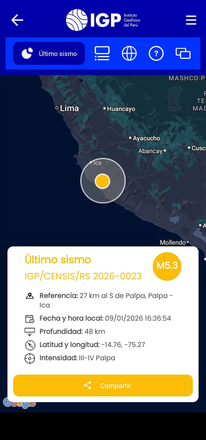 Un sismo de 5.3 grados de magnitud se registró la tarde del jueves 9 de enero a las 4:36 p.m. (hora local) en la provincia de Palpa, región Ica, según informó el Instituto Geofísico del Perú (IGP) a través de su reporte sísmico N.º 2026-0023.