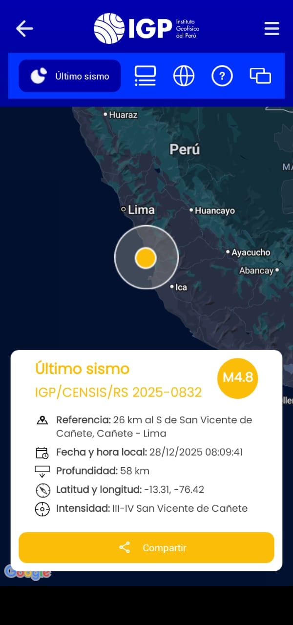 A las 8 de la mañana con 9 minutos de ayer se sintió un movimiento sísmico en la provincia de Chincha. Las personas que aprovechaban el domingo para descansar unas horas más tuvieron que salir de sus casas producto del temblor que tuvo una magnitud de 4.8, con epicentro en San Vicente en la ciudad de Cañete.