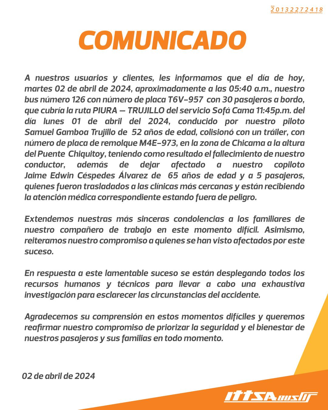 La empresa Ittsa lamentó la pérdida de uno de sus compañeros de trabajo. Además, indicaron que el vehículo había salido la noche del lunes, 11:45 p.m., desde Piura con destino a Trujillo.