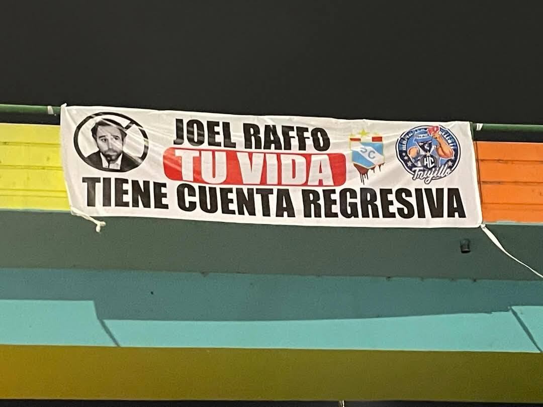La eliminación de la Copa Libertadores y el mal momento que vive el Club Sporting Cristal en el Torneo Apertura de la Liga 1 conllevó a que un grupo de supuestos hinchas rimenses en la ciudad de Trujillo levante su voz y coloquen una banderola con amenazas contra Joel Raffo, actual mandamás del cuadro bajopontino.