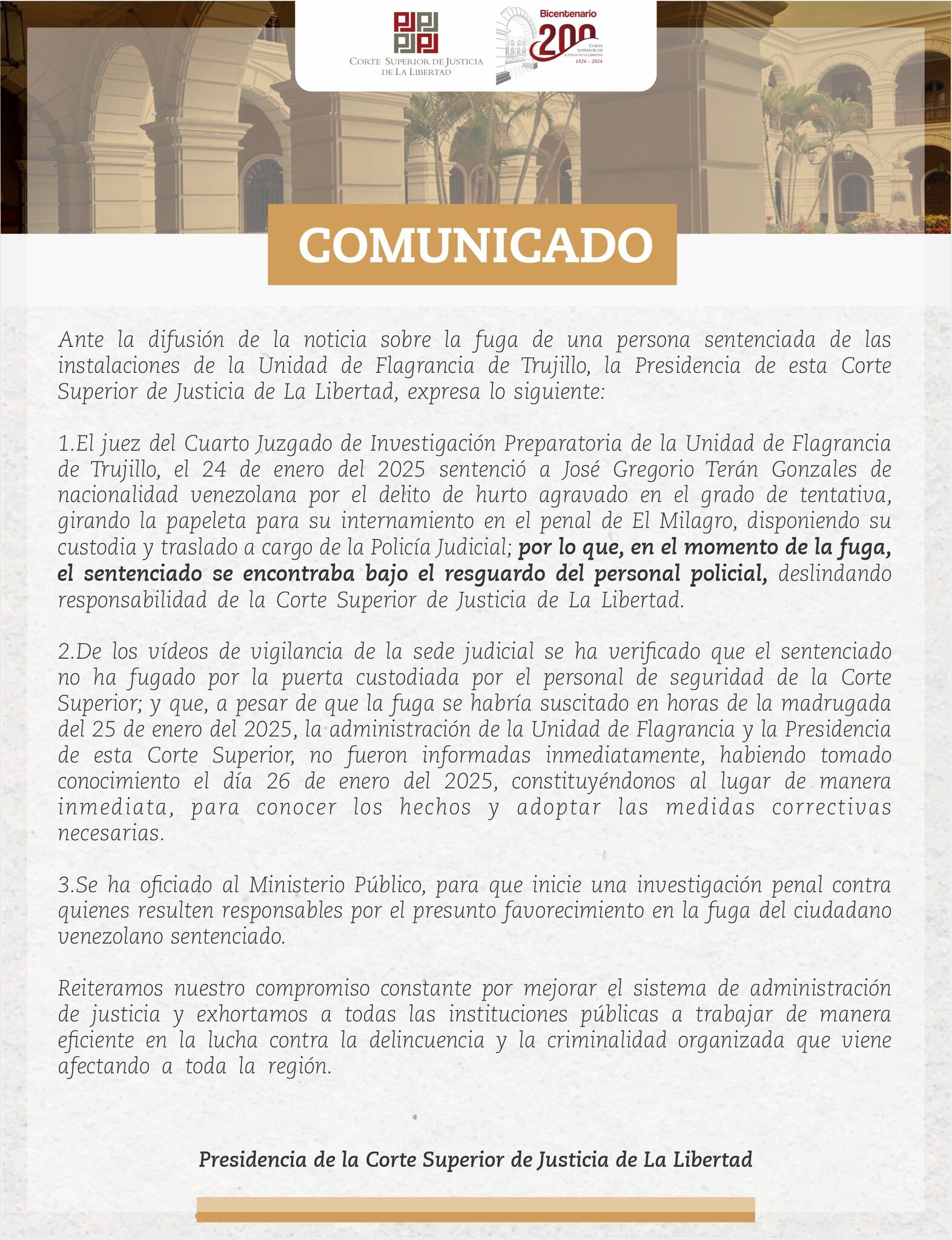 Mediante un comunicado de prensa, la presidencia de la Corte Superior de Justicia de La Libertad deslindó responsabilidad e indicó que el extranjero estaba bajo custodia policial.