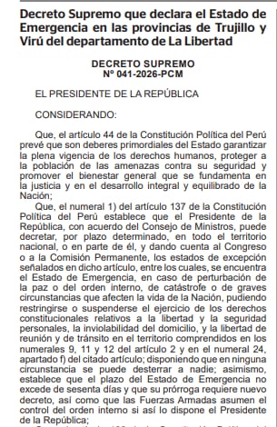 El Gobierno dispuso la declaratoria de estado de emergencia por un periodo de 60 días en las provincias de Trujillo y Virú, en la región La Libertad, con el objetivo de enfrentar situaciones vinculadas a la criminalidad. La medida fue oficializada mediante el Decreto Supremo N.º 041-2026-PCM, publicado en el diario oficial El Peruano.