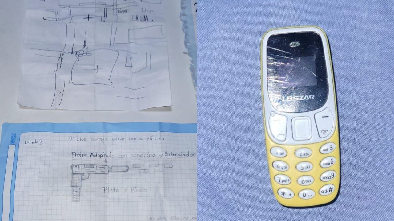 Programa 1 con 49 internos: un punzón y diversos manuscritos conteniendo números telefónicos, stickers de bandas criminales y al parecer un croquis.