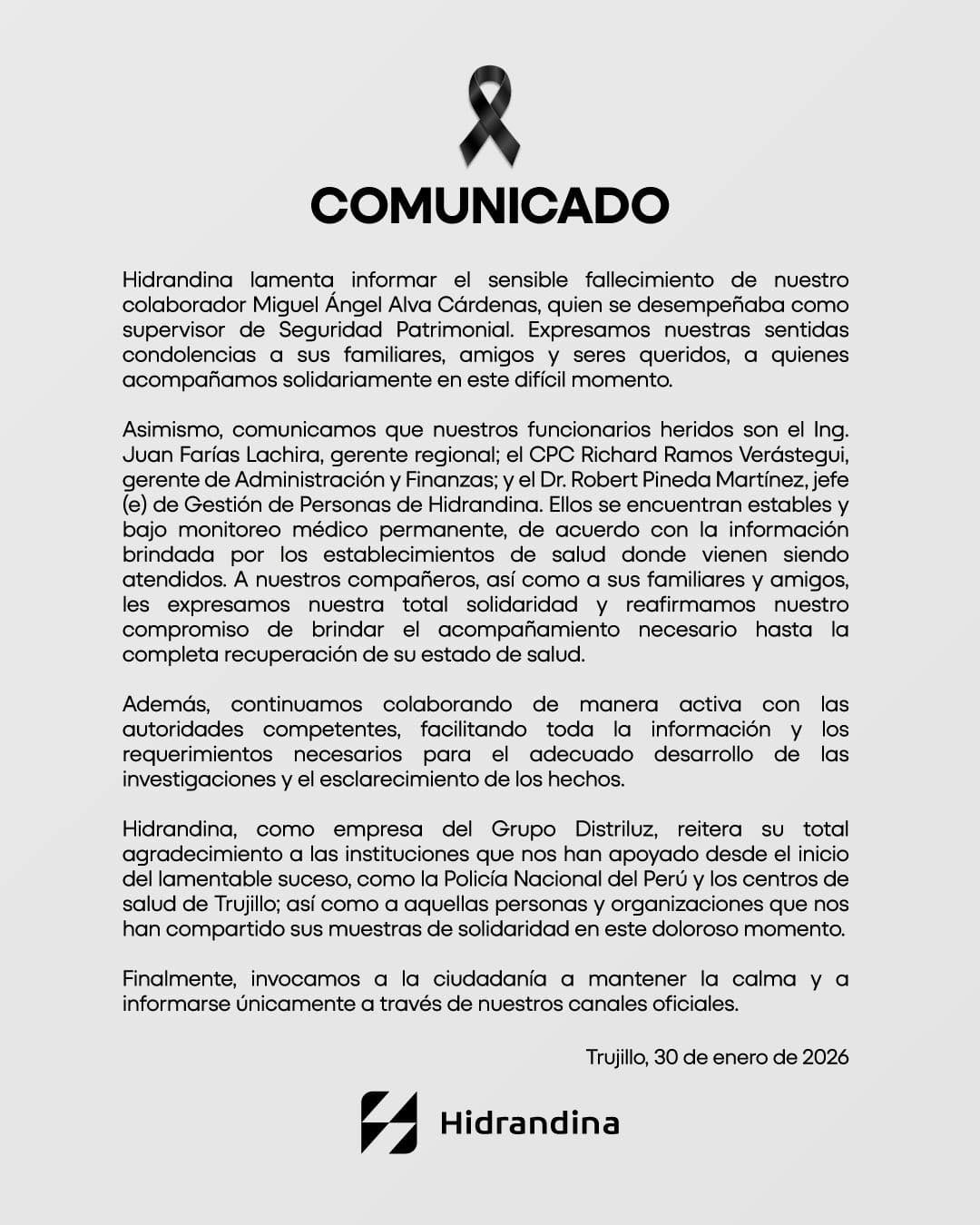 “A nuestros compañeros, así como a sus familiares y amigos, les expresamos nuestra total solidaridad y reafirmamos nuestro compromiso de brindar el acompañamiento necesario hasta la completa recuperación de su estado de salud”, informó Hidrandina en un comunicado de prensa.