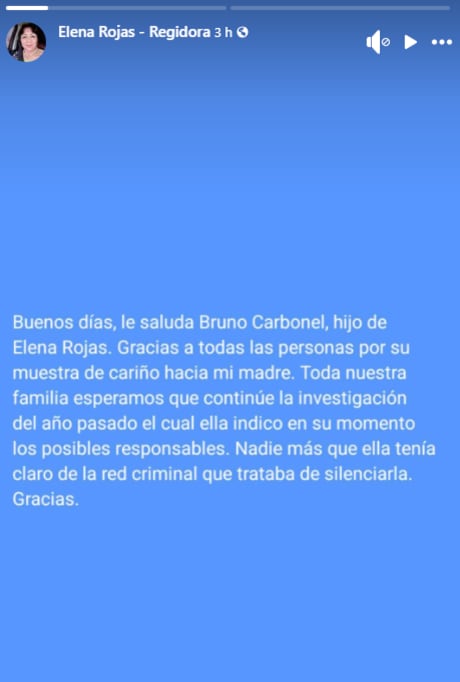 El pedido del hijo de la regidora cobra relevancia a la luz de las declaraciones que Elena Rojas brindó el 27 de diciembre de 2024, tras el atentado con explosivos contra su vehículo. En aquella oportunidad, la autoridad descartó que el ataque estuviera vinculado a extorsión y sostuvo que se trataba de un hecho con motivaciones políticas.