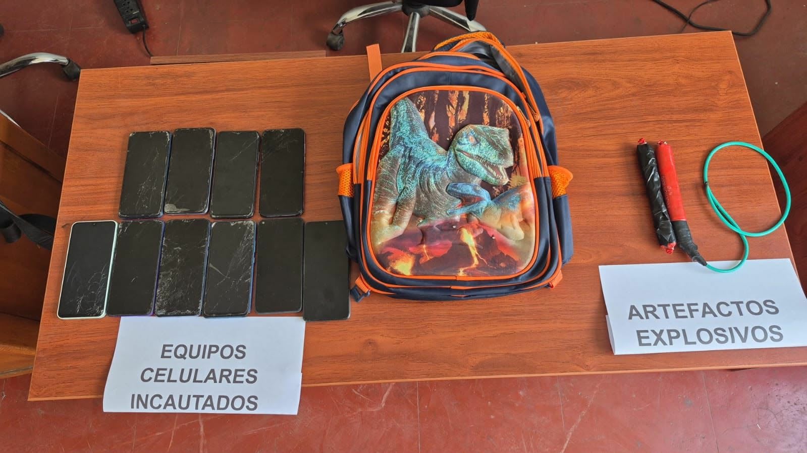 Durante la intervención se incautaron dos artefactos explosivos y diez celulares, los cuales contenían mensajes extorsivos dirigidos a comerciantes del mercado La Hermelinda, así como evidencias de coordinación con internos de centros penitenciarios para ejecutar cobros de cupos, tráfico de terrenos y sicariato.