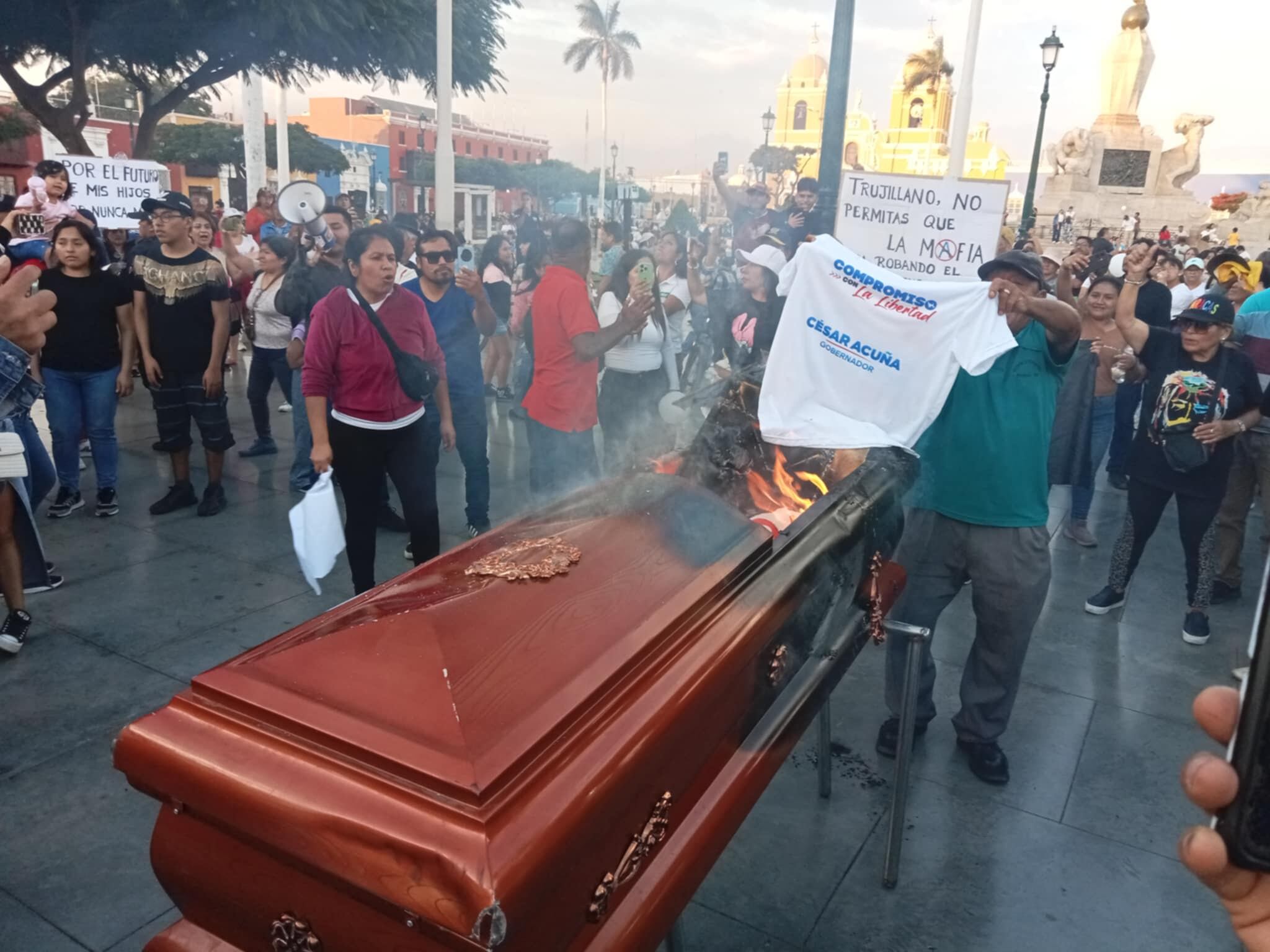 En lo que va del año se han registrado 28 asesinatos en la región La Libertad y los casos de extorsión con dinamita son cosa de todos los días, por eso un grupo de ciudadanos salió a protestar en la Plaza de Armas de Trujillo y para ello quemaron un ataúd.