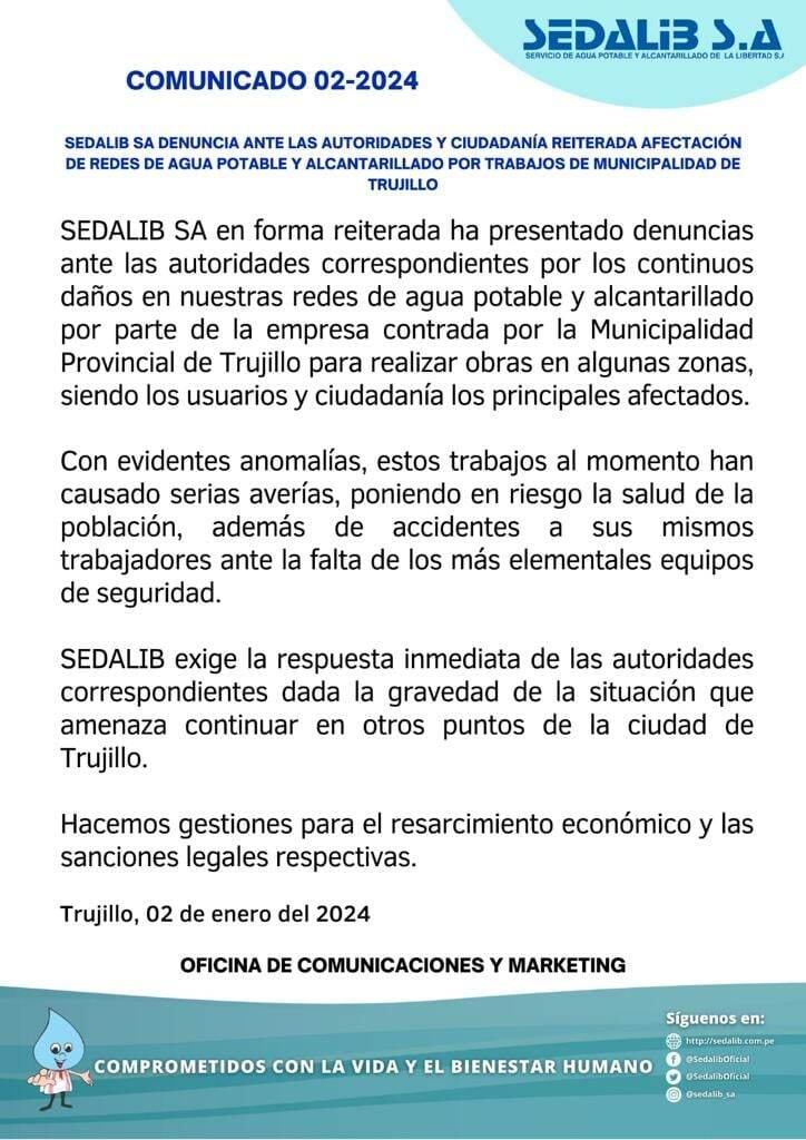 “Sedalib SA en forma reiterada ha presentado denuncias ante las autoridades correspondientes por los continuos daños en nuestras redes de agua potable y alcantarillado por parte de la empresa contratada por la Municipalidad Provincial de Trujillo para realizar obras en algunas zonas, siendo los usuarios y ciudadanía los principales afectados”, manifestó la empresa.