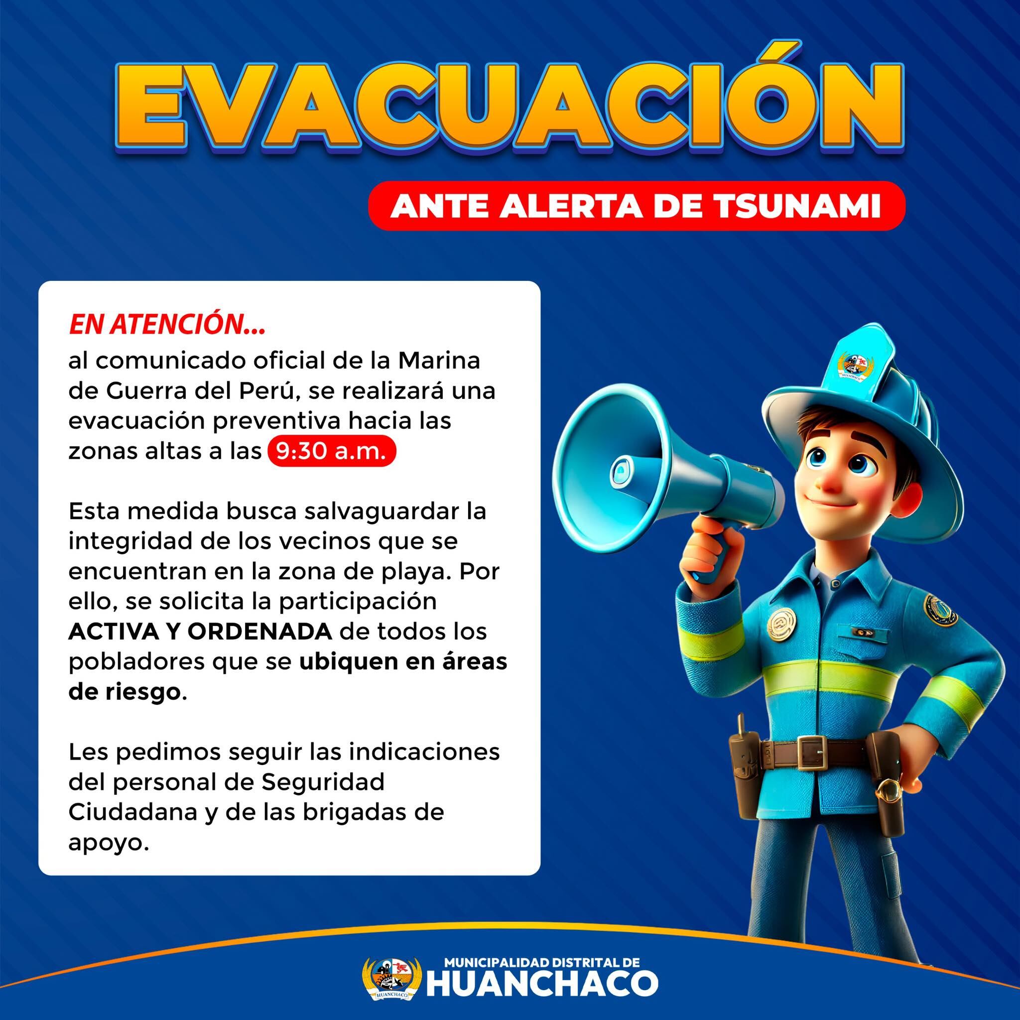 En tanto, por disposición de la Marina de Guerra, en el distrito de Huanchaco, se realizará una evacuación hacia zonas altas.
