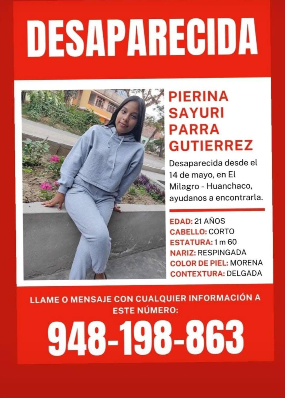 Desesperada se encuentra una madre de familia, quien busca desde hace 11 meses a su hija Pierina Parra Gutiérrez, de 21 años, que desapareció cuando salió desde su vivienda en el centro poblado El Milagro, en el distrito de Huanchaco.