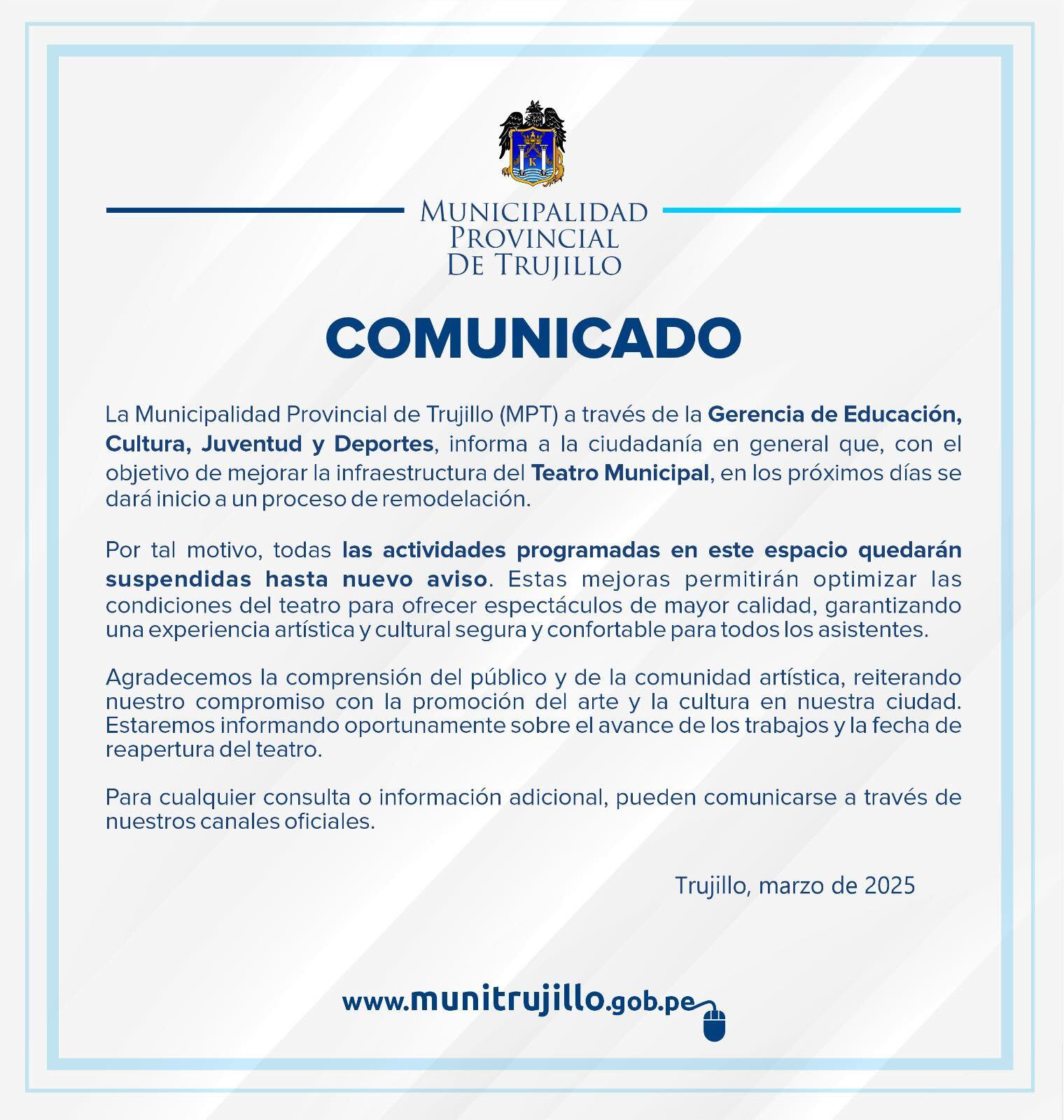 La Municipalidad Provincial de Trujillo (MPT), a través de la Gerencia de Educación, Cultura, Juventud y Deportes, informó a la ciudadanía en general que, con el objetivo de mejorar la infraestructura del Teatro Municipal, en los próximos días se dará inicio a un proceso de remodelación, por lo que quedan suspendidas todo tipo de actividades hasta nuevo aviso.