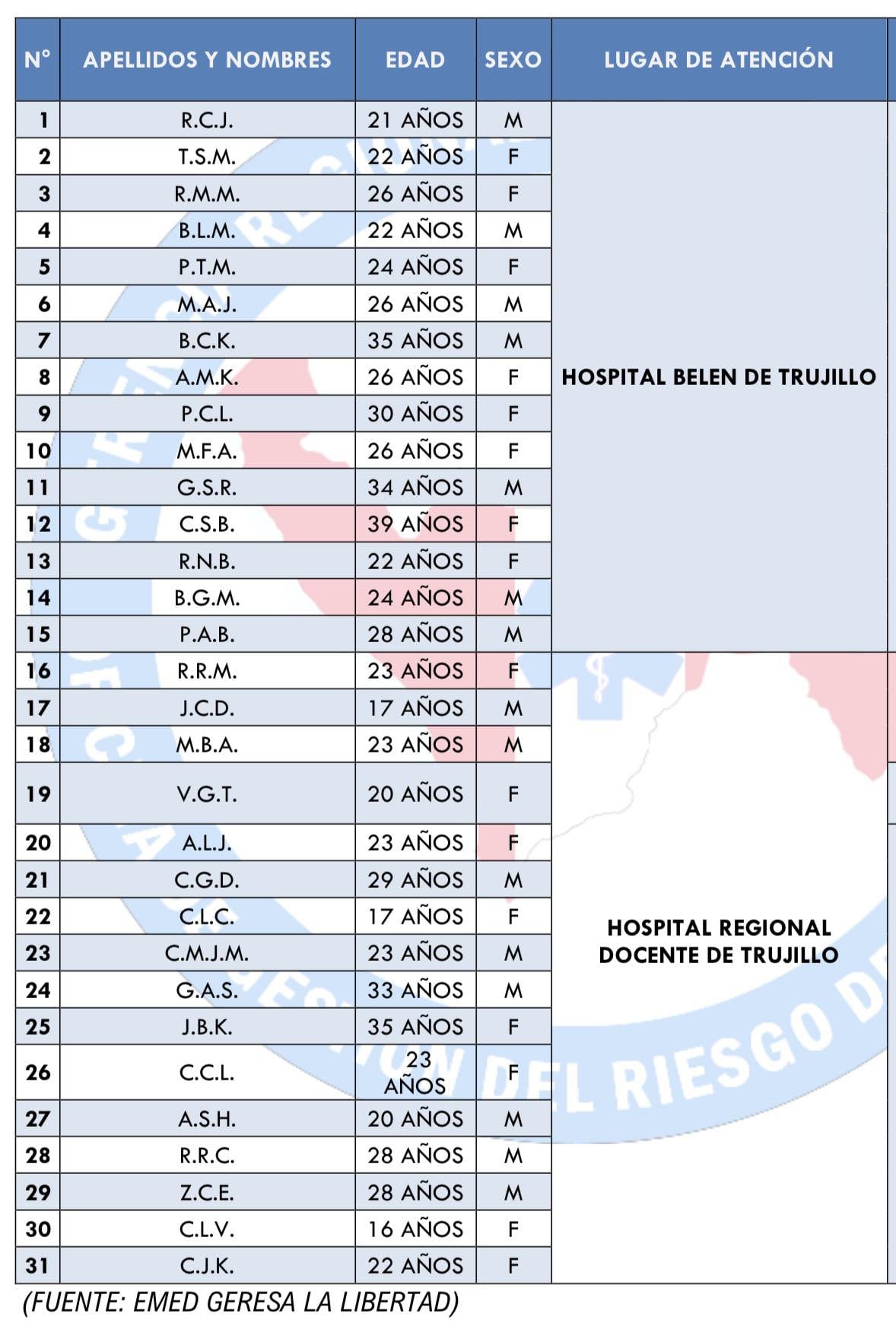 Según la prensa local, al menos 31 personas resultaron heridas. Las víctimas fueron evacuadas en dos grupos, 15 personas se trasladaron al Hospital de Belén y otras 16 al Hospital Regional Docente en el departamento de Trujillo.