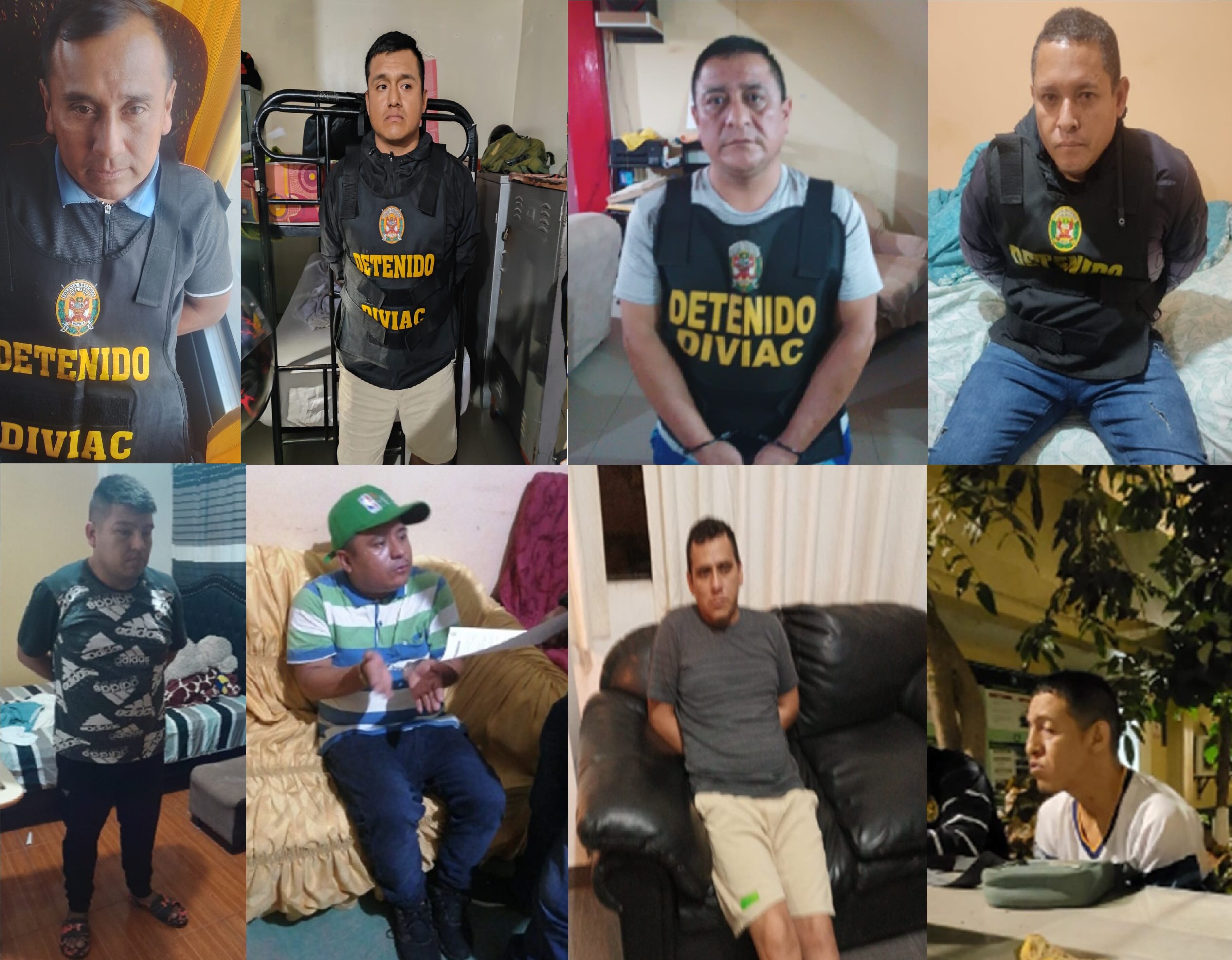 En la región Lambayeque fueron detenidos ocho imputados de manera preliminar e identificados como Deyvi Wagner Vallejos Benavides alias “La Samba”, Yván Junior Tesén Zurita (a) “Chacal”, Luis Alberto Calvay Mera (a) “Gato Calvay”, Presbítero Medina Rodríguez (a) “Piturri”, Luis Gustavo Barbarán Merino (a) “Gustavo” y Walter Wenceslado Villegas Valdivieso (a) “colorado”.