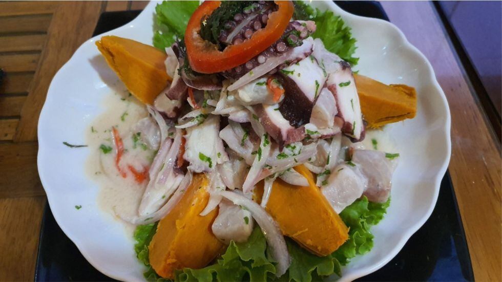 El sol se va ocultando y llegó la hora de cenar. En el restaurante Puerto Azul nos recibe la pareja dueña del restaurante, Enzo Vicente Espinoza y Juana Lizarme, quienes prepararon arroz con mariscos, ceviche de lenguado y pulpo y chita en salsa.