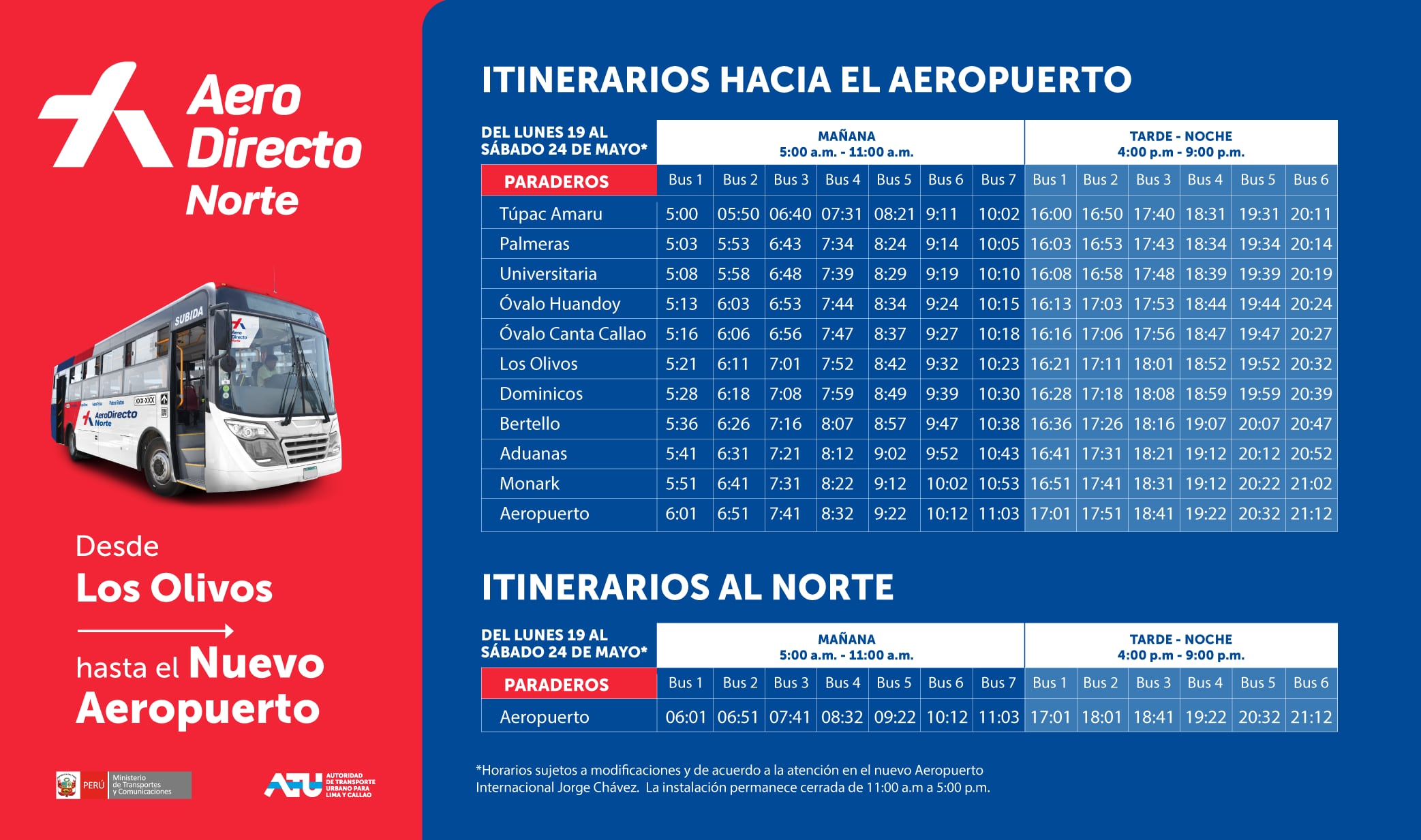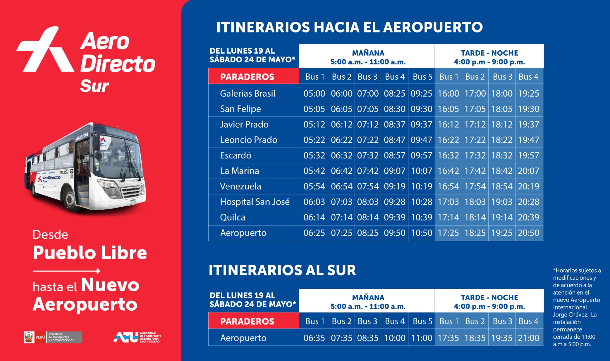 Del lunes 19 al sábado 24 de mayo, la ATU presentó el itinerario oficial de sus cinco rutas, permitiendo a los usuarios planificar sus viajes con anticipación. AeroDirecto opera en dos franjas horarias: