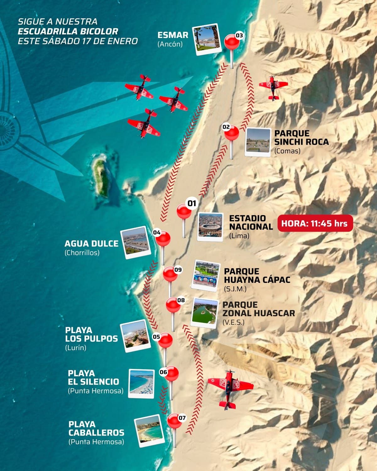 La exhibición iniciará al mediodía desde la Escuela de Submarinos Marineros (ESMAR) en Ancón, continuará por el Parque Sinchi Roca en Comas y hará una parada destacada frente al Estadio Nacional en el Cercado de Lima alrededor de las 11:45 a.m. Posteriormente, las aeronaves sobrevolarán el Parque Huayna Cápac en San Juan de Miraflores y el Parque Zonal Huáscar en Villa El Salvador, cubriendo así los principales distritos del cono norte, centro y sur de la ciudad.